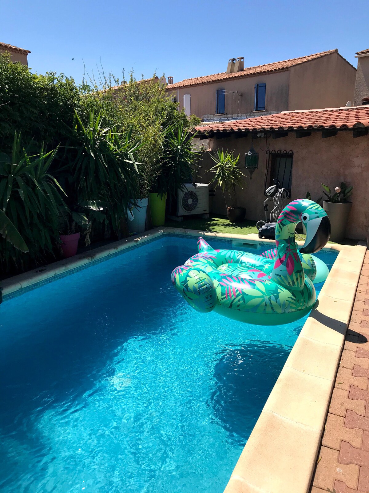 Căn hộ có điều hòa ở 3 phòng ngủ và phòng khách ở tầng trệt, diện tích 90 m2, 3 phòng ngủ Rộng rãi với khu vườn 200 m2, BỒN TẮM SỤC KHOÁI 5 CHỖ HOẠT ĐỘNG SUỐT CẢ NĂM và sân chơi petanque, chỗ đỗ xe trong một không gian yên bình và thân thiện, gần các cửa hàng và một con đường thoải mà qua đó bạn có thể đến nhà ga, trung tâm thành phố, bến cảng hoặc bãi biển Cách trường đua Paul Ricard 20 phút, có thể đỗ xe máy trong gara