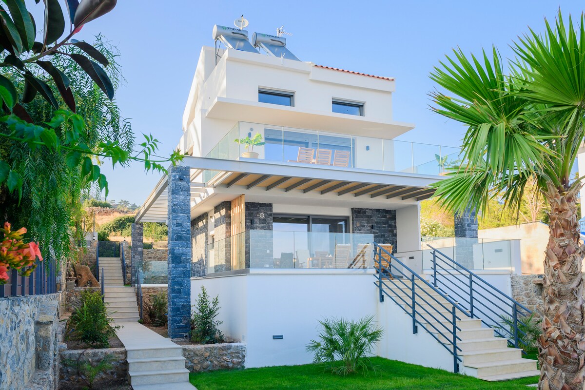 Welcome to your dream villa, built in contact with a rock formation! This residence offers two bedrooms with private en-suite bathrooms. (1 with extra sofa bed) The villa is situated on an 6000m2 plot filled with pine trees and olive groves. Several steps lead down to your secluded beach.The kitchen and the dining room in the aithrio feature panoramic sea views.The outdoor spaces of 120 m2 include a sitting area protected by a shading pergola,sun loungers an outdoor dining place,barbeque, shower