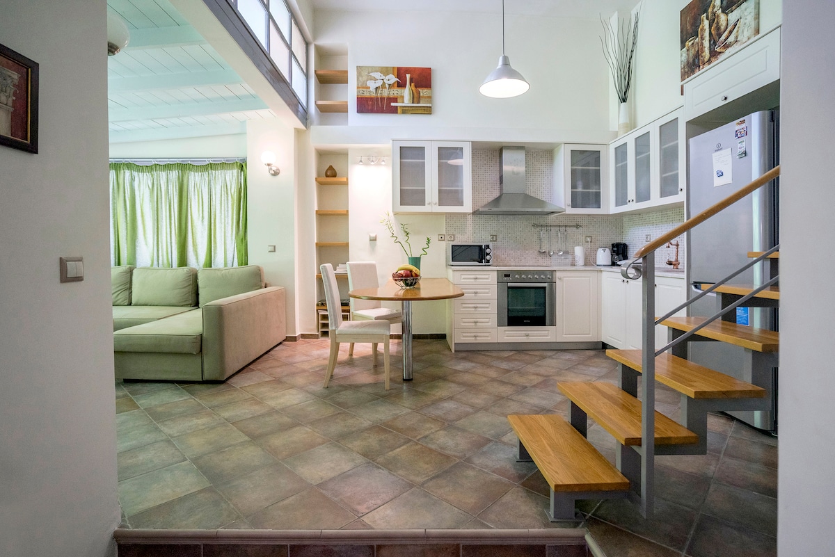 có một phòng khách với ghế sofa góc dễ dàng biến thành giường, nằm trước lò sưởi tạo ra bầu không khí ấm áp và ấm cúng trong những đêm mùa đông lạnh giá. Phòng khách có tầm nhìn tuyệt đẹp ra khu vườn tươi tốt. Bếp mở, được xây dựng có một bàn cho bốn người, được trang bị đầy đủ các thiết lập và tất cả các dụng cụ nhà bếp cần thiết và có tủ lạnh rộng rãi, máy giặt, lò nướng điện và bốn (4) bếp gốm. Phòng ngủ nằm phía trên phòng tắm và hành lang lối vào. Nó có một giường cỡ queen và một tủ quần áo lớn được xây dựng và có tầm nhìn ra khu vườn. Khi mở cửa sổ chính kiểu Pháp của phòng khách, bạn bước ra trong một khu vực lát gạch được bố trí đẹp mắt với bãi cỏ và cây cao mang đến sự riêng tư hoàn toàn. Trong vườn, có một bàn có thể chứa mười (10) người, mời bạn thưởng thức cà phê, bữa trưa hoặc bữa tối với bạn bè bất kỳ lúc nào trong ngày, với tầm nhìn ra khu vườn xanh tươi.