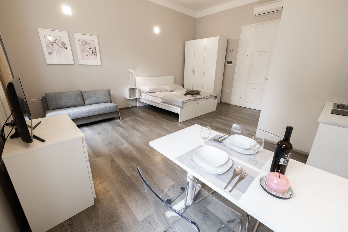 Căn hộ studio ấm cúng của chúng tôi có khu vực sinh hoạt sáng sủa với ghế sofa thoải mái, không gian làm việc, Wi-Fi tốc độ cao, giường cỡ queen và tủ quần áo. Bếp đầy đủ tiện nghi bao gồm bếp, lò nướng và tủ lạnh. Tận hưởng phòng tắm hiện đại tuyệt đẹp với buồng tắm đứng, cửa kính, bồn rửa và bồn cầu, với khăn tắm và đồ vệ sinh cá nhân được cung cấp. Nằm trên sông Drava ở trung tâm Maribor, bạn cách các điểm tham quan, cửa hàng và nhà hàng một quãng đi bộ ngắn. Có chỗ đỗ xe riêng trước nhà.