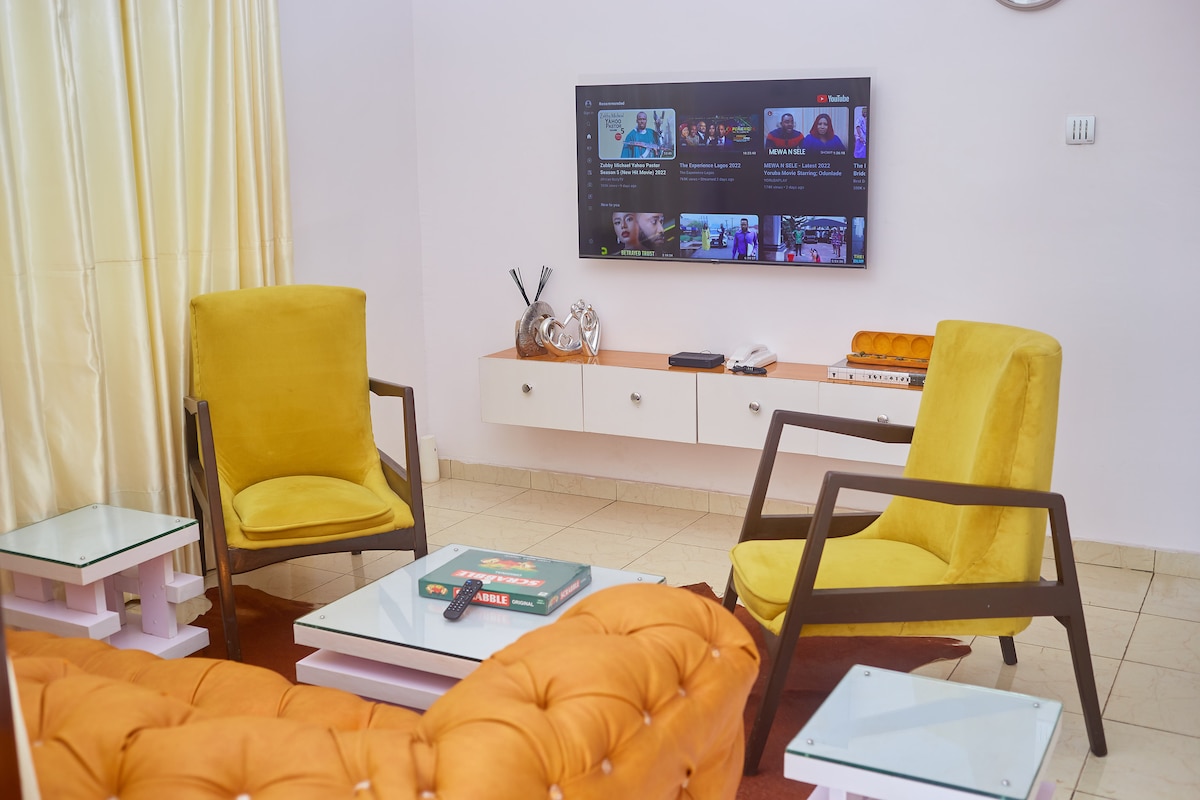 Một căn hộ 2 phòng ngủ với lớp hoàn thiện hàng đầu, được xây dựng để mang lại sự thoải mái và thư giãn. Nằm trong một môi trường yên tĩnh, thanh bình và thanh bình ở Agbelekale, Ekoro Road, ngoài Abule-Egba, Lagos. Đường phố được khóa liên động. Điều hòa không khí, TV thông minh + bộ giải mã, tủ đông, tủ lạnh, máy nước nóng, máy giặt, khu vực ăn uống, nguồn điện 24/7 được dự phòng bằng máy phát điện và biến tần năng lượng mặt trời, Wi-Fi, không gian làm việc, gần trung tâm thương mại và sân bay. Điều hòa nhiệt độ chạy bằng điện công cộng và máy phát điện.