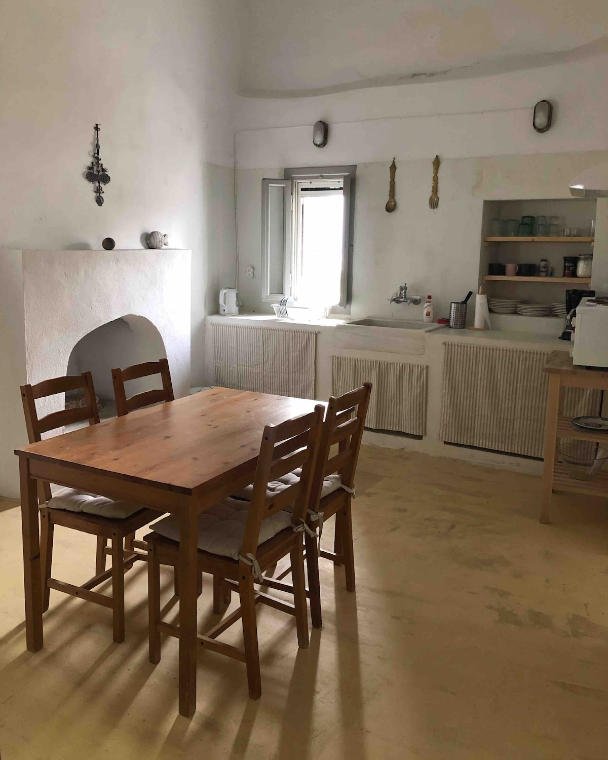 Một nơi cách xa thế giới, gần Derya, một ngôi nhà thôn quê được xây dựng hoàn toàn bằng đá, hòa mình vào thiên nhiên, với những cây ô liu hàng trăm năm tuổi trong vườn. Tôi tin rằng đây không phải là một nơi mà những người đang tìm kiếm sự thoải mái của một thành phố lớn, khu nghỉ dưỡng hoặc khách sạn sẽ hạnh phúc, mà là một nơi mà những người muốn thư giãn và bình tĩnh sẽ rất hạnh phúc. Những người sợ nhện, kiến, v.v. không nên đến vì chúng tôi muốn họ biết rằng chúng tôi đã chiếm chỗ của họ. Lưu ý: Thật không may, chúng tôi đã phải trả tiền cho củi trong mùa đông do điều kiện của đất nước chúng tôi.