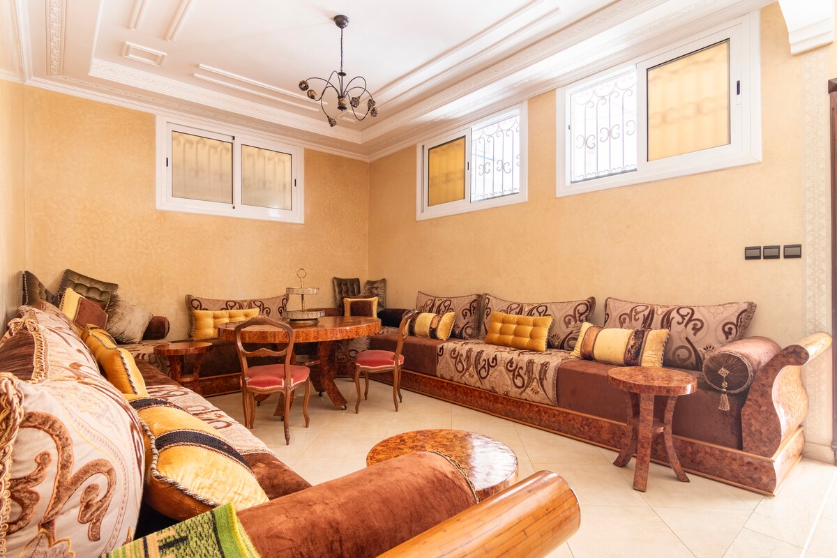 Villa de grand standing très proche du Golf du Soleil, située dans une résidence sécurisée et paisible avec piscine commune. Grand jardin privé paysager avec salon extérieur, barbecue et four traditionnel. Hammam marocain authentique. Personnel de service hautement qualifié (ménage irréprochable et cuisine marocaine sur demande). Quatres chambres élégantes avec lits doubles médicaux haut de gamme. Climatisation intégrale, fibre très haut débit et propreté digne d’un hôtel 5★.