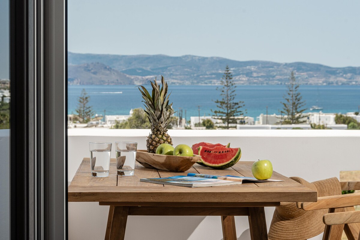 Panoramic sea views and a private hot tub on your own balcony. Flat Triton, part of Enosis Apartments, is located on the top floor at the well-known Agia Anna Beach of Naxos, just steps from the long sandy shore and the crystal clear blue waters. This Cycladic-style studio features a spacious private balcony with a double pouf sunbed and open views over the Aegean Sea. A well-positioned seaside stay offering privacy, comfort, and direct access to one of Naxos’ most popular beaches.