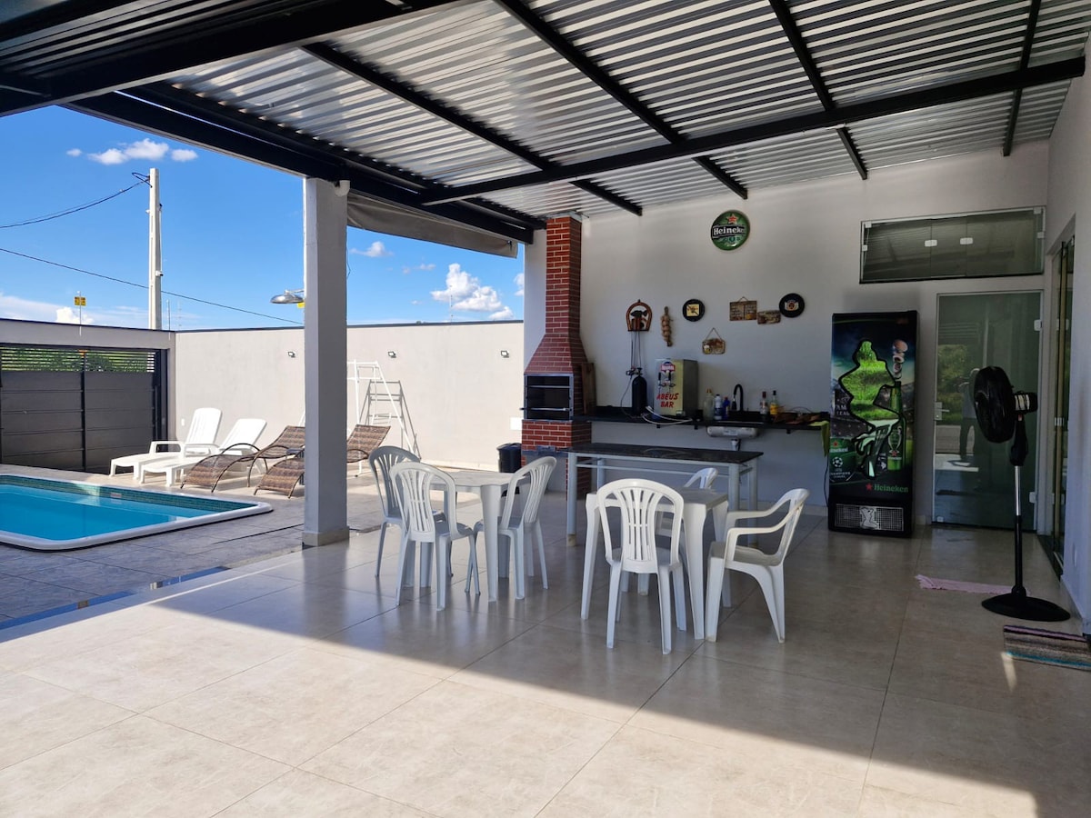 Trang trại của chúng tôi tại Fonte có phong cách mộc mạc, rõ ràng, thoáng mát và có nhà bếp đẹp nhất ở Brazil với bếp củi và tất cả dụng cụ nấu ăn! Nó có một khu vườn xinh đẹp với vườn cây ăn quả và hoa. Có 2 dãy phòng với giường queen và giường đơn và điều hòa không khí, 1 phòng ngủ với 4 giường đơn, quạt trần và phòng tắm ở phía trước, phòng khách với TV 50'và bầu trời. Khăn trải giường được cung cấp. Nó có hồ bơi tròn và khu vực nướng. Và một khu vực dành cho người sành ăn với TV, ghế sofa, bàn, phòng tắm và nhà bếp.
