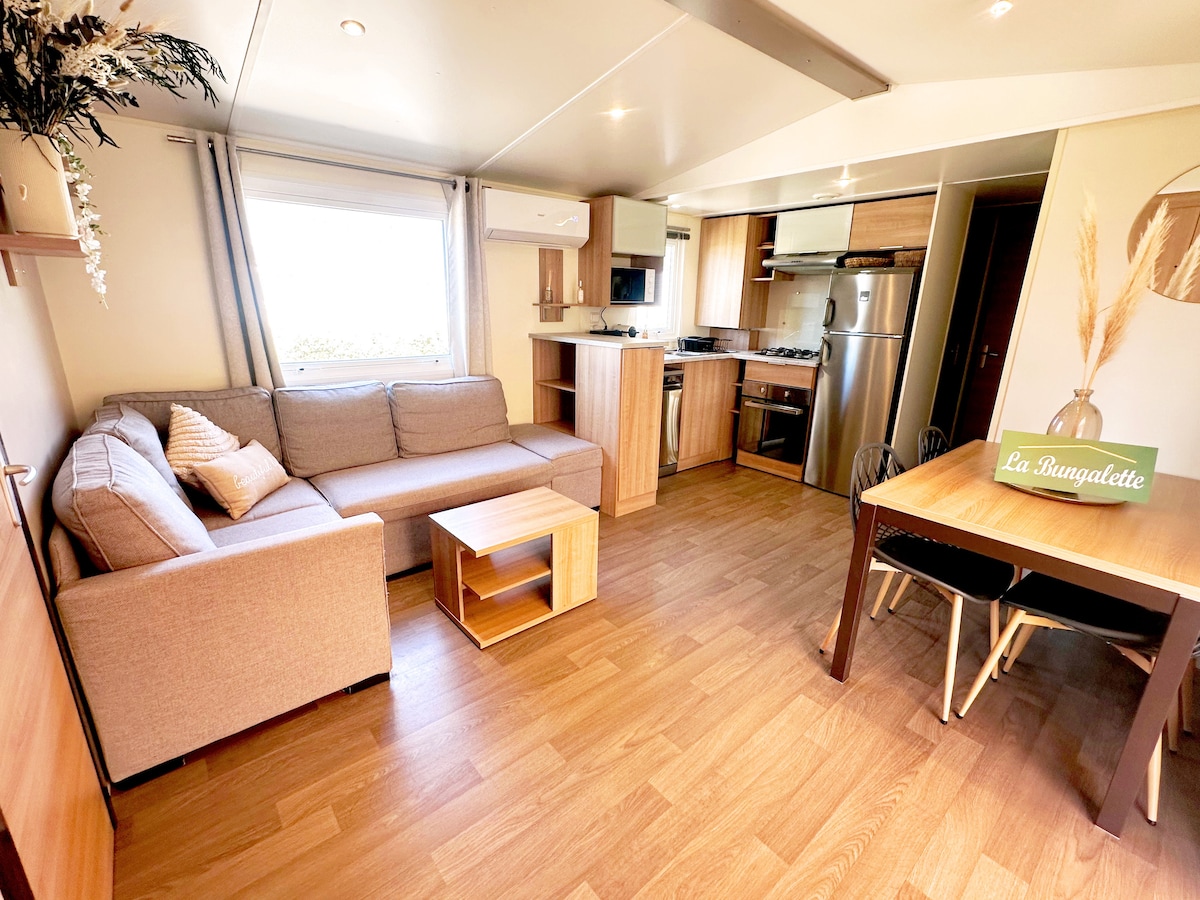 Grand mobile home neuf de 2025, avec wifi, capacité 6 personnes (une chambre parentale, deux chambres avec chacune 2 lits simples), deux salles de bain et 2 wc. Un grand canapé velours marine très confortable vous accueille, un espace repas à l'intérieur et un autre sur la terrasse couverte vous permet d'être dedans/dehors et de profiter de tout l'espace au calme. Les équipements sont de qualité, dans des tons neutres et élégants, avec en prime un superbe jardin paysagé et 2 places de parking.