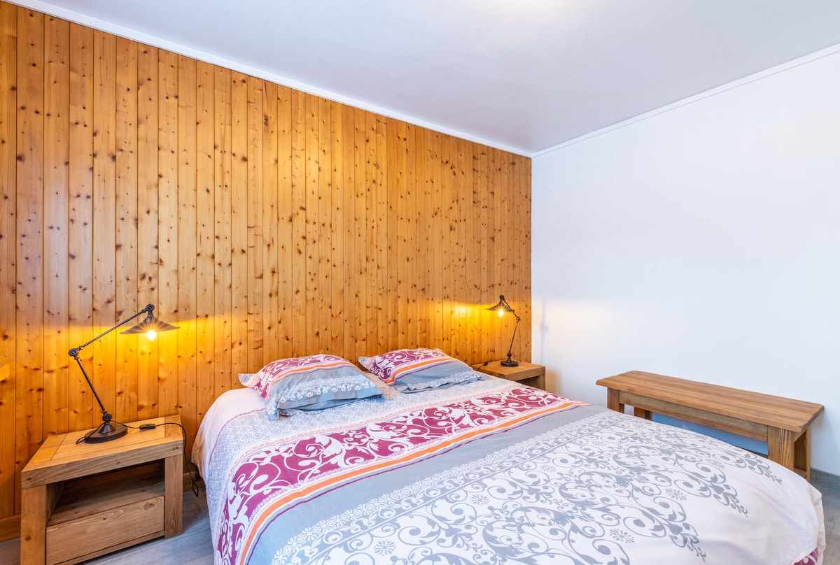 Ở rìa rừng, căn hộ 30 m2, độc lập, yên tĩnh, không bị bỏ qua và 2 phòng mới. Căn hộ được trang bị đầy đủ bao gồm phòng khách với bếp mở (lò nướng, lò vi sóng, máy rửa chén, tủ lạnh, tủ đông, máy Nespresso), khu vực ăn uống, phòng khách, phòng tắm (vòi sen và nhà vệ sinh) cũng như phòng ngủ với giường cỡ king 160 x 190. Chỗ đỗ xe riêng. Căn hộ mới. Quang cảnh rất đẹp của dãy núi Mont Blanc và Aiguille du Midi. Tuyệt vời cho một cặp đôi