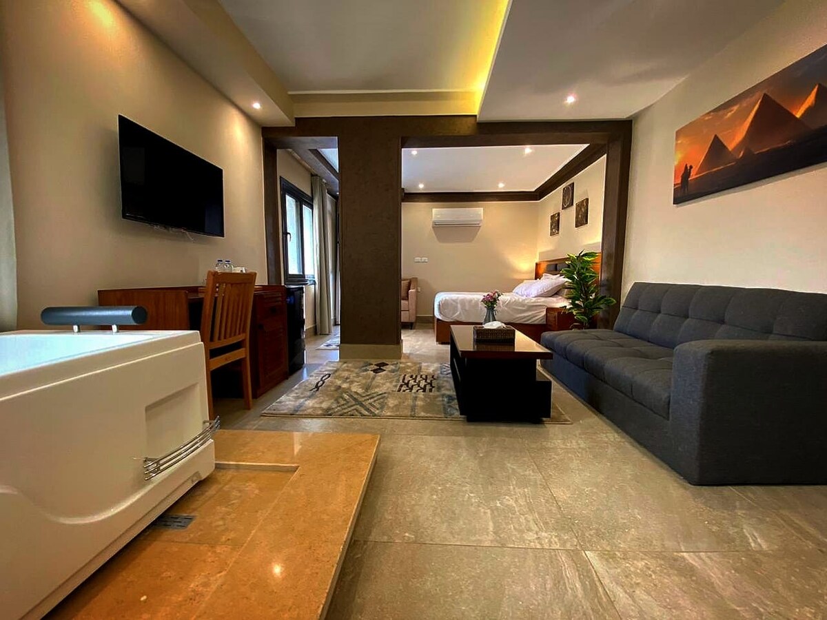 The room is about 30 square meters, everthing in the room is new and with high quality, and the general atmosphere in the room gives you a feeling of comfort, and the room has a private toilet and it's own heritage with pyramids view where ( 20 square meters), and there is free internet service in the room and a small refrigerator. There is also a great heritage with pyramids view where can eat food and drinks, enjoy the sun during looking at the pyramids