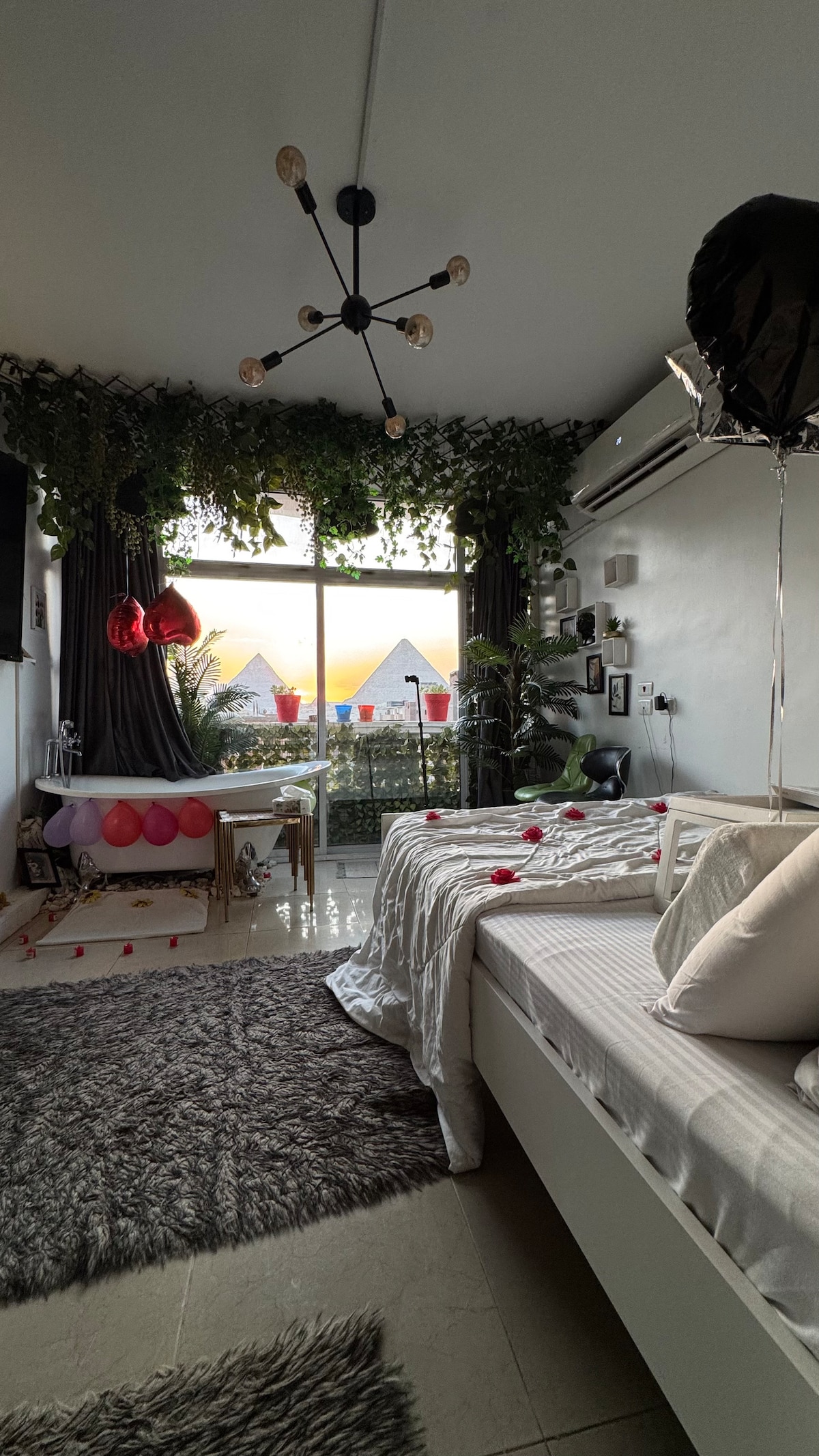 Chào mừng bạn đến với khu nghỉ dưỡng riêng trên tầng thượng ở trung tâm Giza! Studio quyến rũ này nằm trên sân thượng rộng rãi, có tầm nhìn ngoạn mục ra Kim tự tháp - hoàn hảo cho cà phê bình minh, hoàng hôn nằm dài trên võng hoặc ngâm mình trong bể sục của riêng bạn dưới những vì sao. Nhà bếp đầy đủ tiện nghi Khu vực ngủ và thư giãn thoải mái Lối vào riêng cho sự yên bình và riêng tư của bạn Cho dù bạn ở đây để phiêu lưu hay thư giãn, studio này mang đến sự pha trộn hoàn hảo giữa sự thoải mái và tầm nhìn khó quên.
