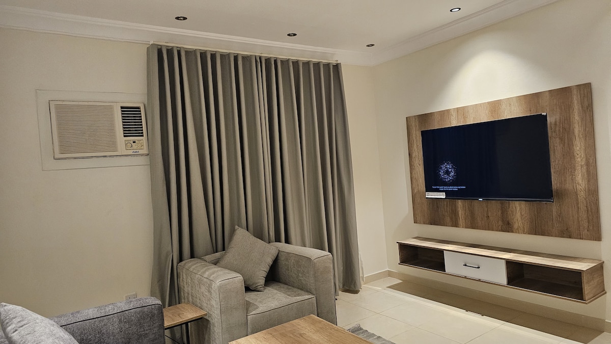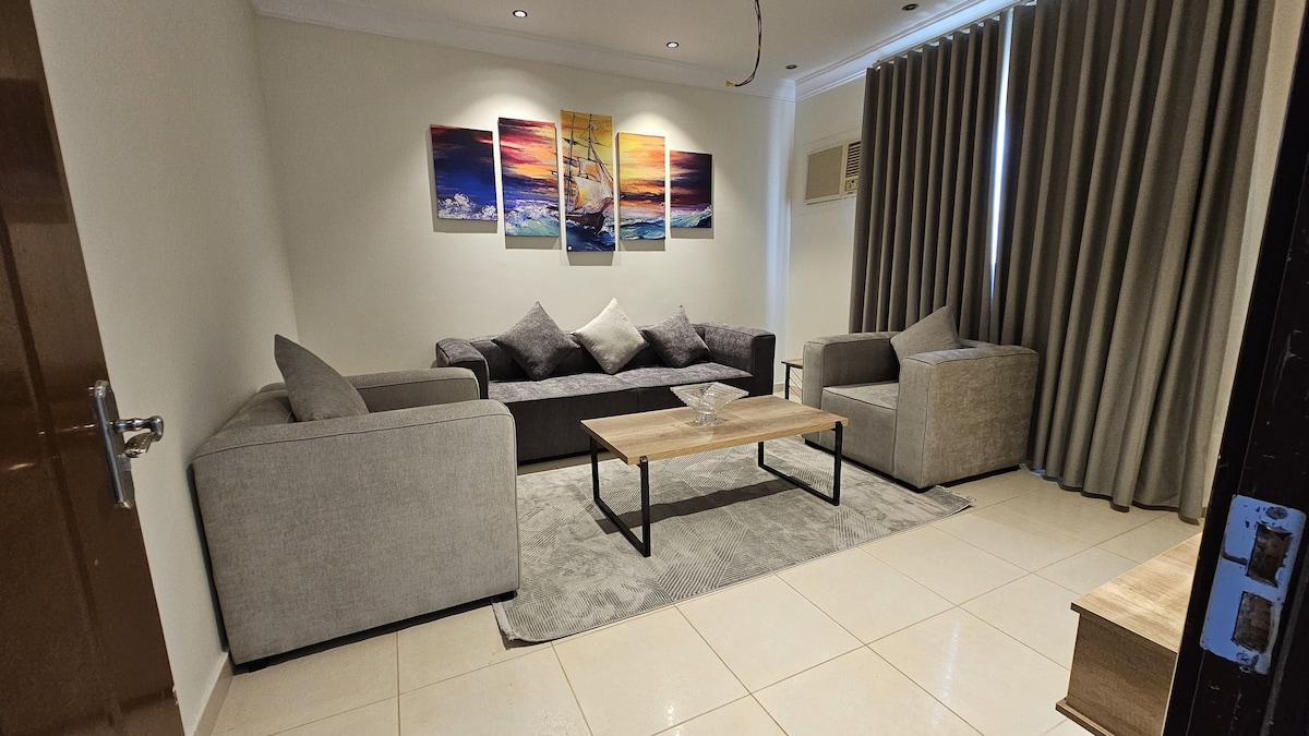 Căn hộ tự vào thanh lịch với phòng ngủ và phòng chờ với góc và trang trí đặc biệt, có vị trí yên tĩnh và bãi đỗ xe ô ở Thành phố công nghiệp Yanbu. Sẵn có : Nhà bếp và tủ lạnh Corner Cannap, Bàn cà phê, TV lớn Giường Queen