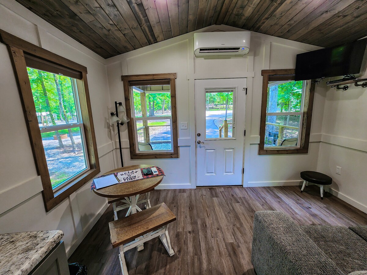 Ấm cúng và yên tĩnh, Premier Cabins của chúng tôi cung cấp cho bạn nơi nghỉ dưỡng ngoài trời mà bạn đang tìm kiếm và tất cả các tiện nghi bạn cần. Cabin theo phong cách nhà nghỉ thôn dã hiện đại của chúng tôi tự hào với các điểm nhấn được trang bị đầy đủ tiện nghi như ga trải giường sang trọng, chỗ ngồi thoải mái và hơn thế nữa. Bạn sẽ phải trả $ 45 cho mỗi khoản phí vệ sinh cho thú cưng khi nhận phòng nếu bạn quyết định mang theo thú cưng được chấp thuận. 1 giường Queen và 2 giường đơn