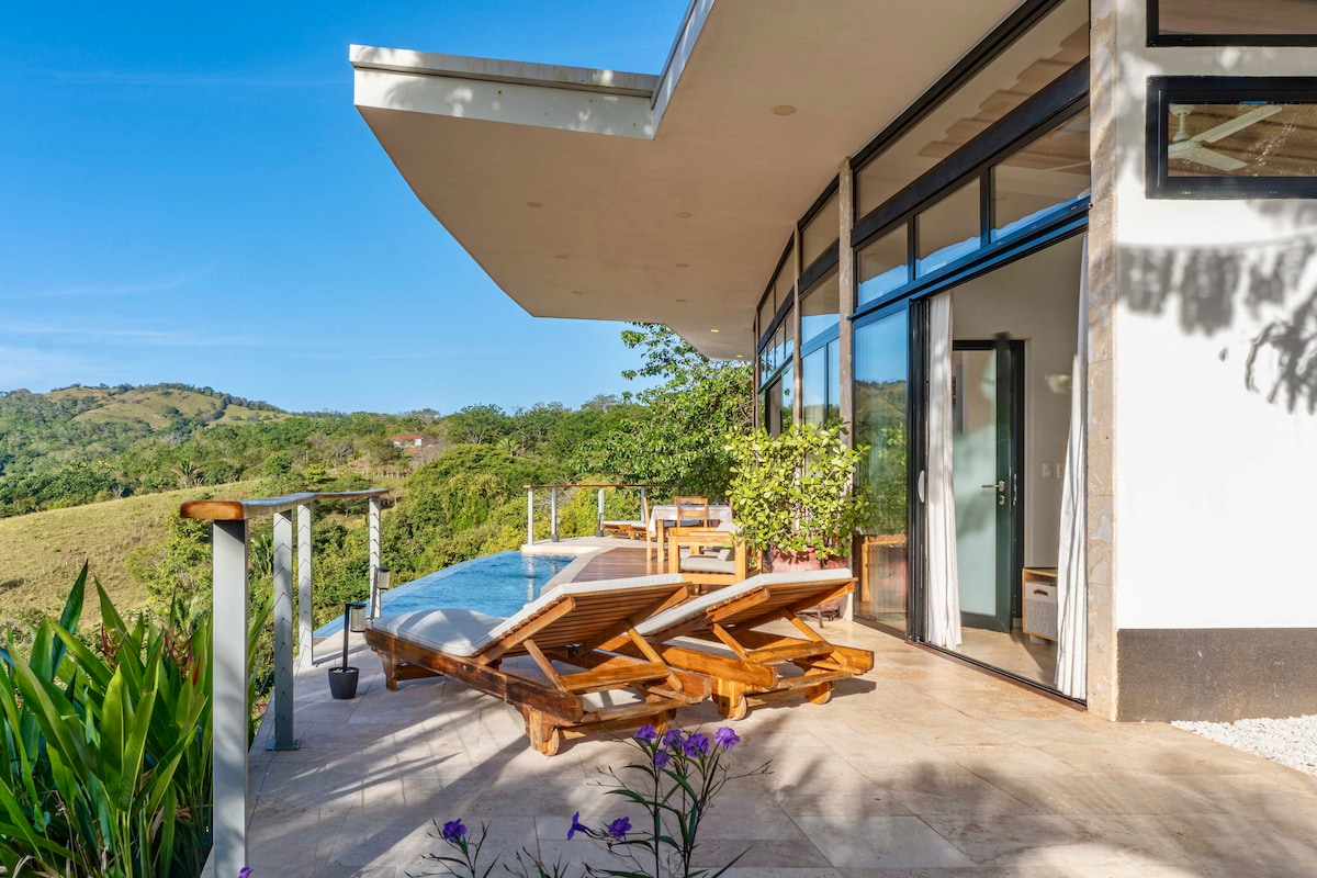 New, luxurious, hillside bungalow with PRIVATE infinity pool and stunning ocean-view; off the beaten path •2 Queen suites, each with private ensuite, A/C •Full kitchen & seamless indoor–outdoor living •Close to beaches, wildlife, and adventure tours •Travel Times: Approximately 2 ½ hours from Liberia Airport (LIR) and about 5 hours from San José Airport (SJO) by car •4WD SUV required for the scenic rural drive