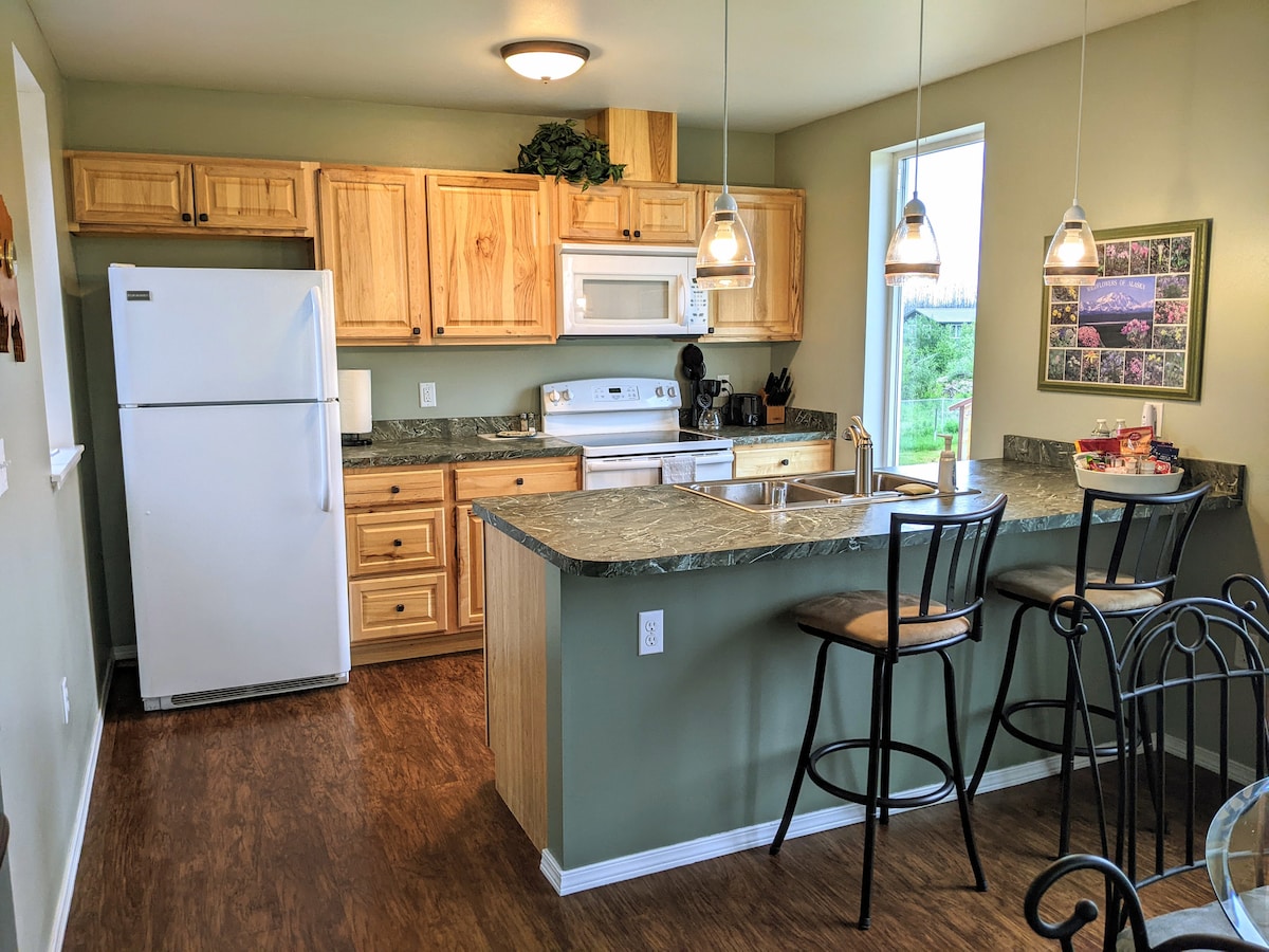Thư giãn trong căn hộ hai tầng yên bình, riêng tư, không khói thuốc này với tầm nhìn ra núi tuyệt đẹp, gần những con đường mòn và tour du lịch trong khu vực. Nằm cách trung tâm thành phố Palmer chỉ 10 đến 15 phút lái xe và chỉ cách Đỉnh Pioneer cao 6398 feet hai dặm với sông băng chảy qua sông Knik tại căn cứ của cô. Palmer giàu lịch sử và phiêu lưu. Thưởng thức các tour du lịch bao gồm những cuộc phiêu lưu từ nhẹ đến cực đoan trên khắp thung lũng này. Tham quan sông băng, trang trại rau khổng lồ, câu cá, tour ATV và xe trượt tuyết, trang trại tuần lộc và bò xạ hương, v.v.