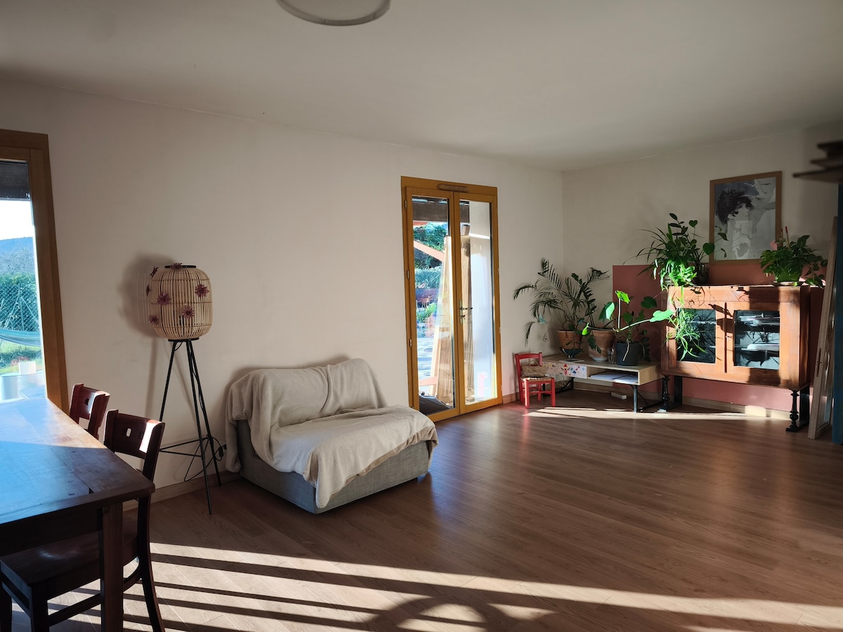 Thư giãn trong không gian yên tĩnh, có điều hòa không khí này. Căn hộ hoàn toàn độc lập, bạn sẽ tận hưởng một sân thượng lớn với tầm nhìn đẹp, tiệc nướng và chỗ đỗ xe có bóng râm. Máy pha cà phê Tassimo. Giường 140x190. Vị trí lý tưởng để tham quan phía Nam Ardèche (Pont D'Arc, Grotte Chauvet, Gorges De L'Ardèche) và Drôme Provençale... và gần đường cao tốc. Chúng tôi sẽ rất vui được đón tiếp bạn cùng Sidney, Labrador và Oslo của chúng tôi, Golden của chúng tôi.