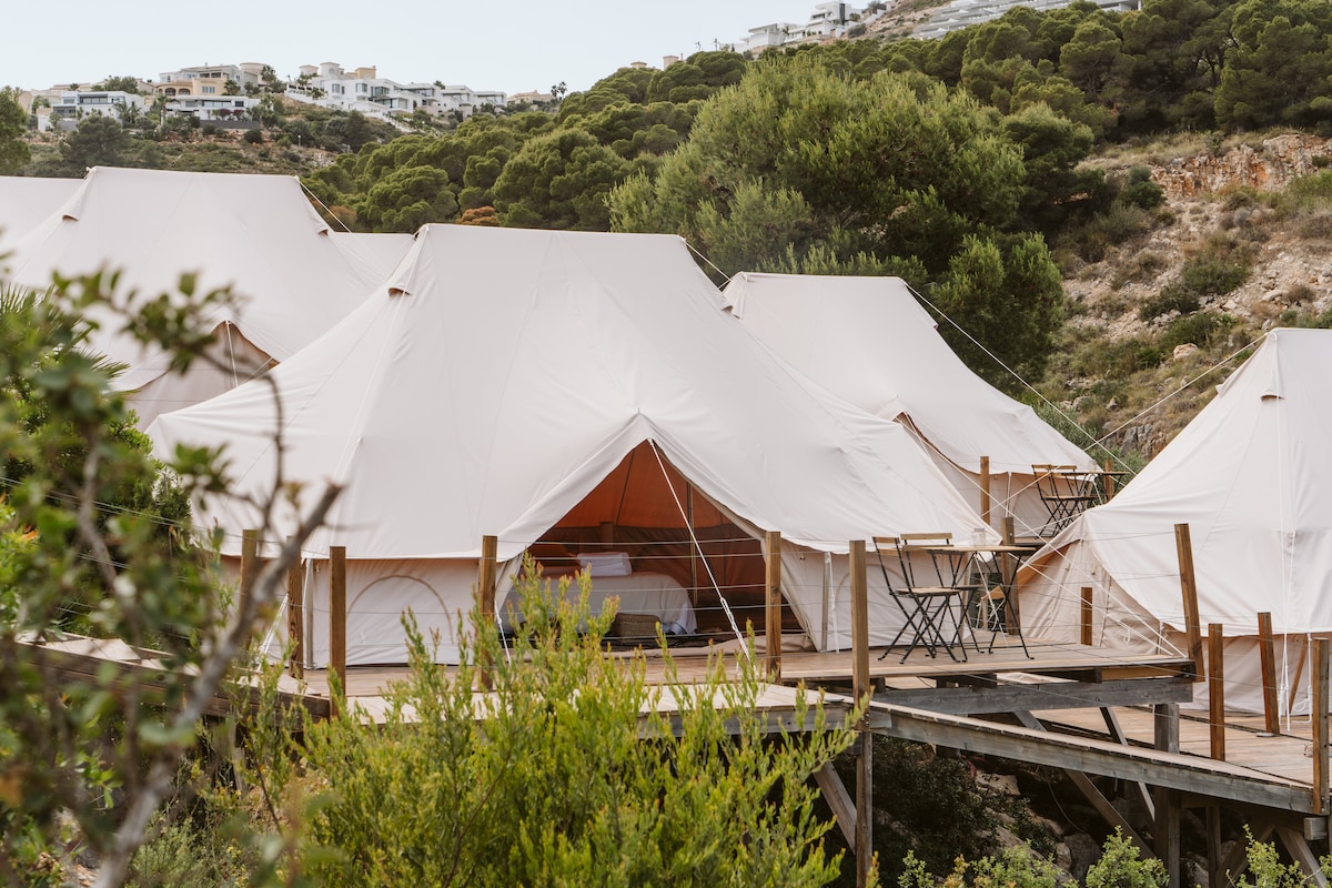 Lều hạng sang nằm bên trong khu cắm trại cung cấp các lều khác, tiện nghi phòng tắm chung, nhà hàng, hồ bơi, khu vực thư giãn và thuyền kayak và SUP cho thuê. Khu cắm trại nằm trên một vách đá với tầm nhìn ra đại dương tuyệt đẹp phía trên Cala Moraig ở Benitachell, mang đến sự pha trộn hoàn hảo giữa phiêu lưu và thư giãn.