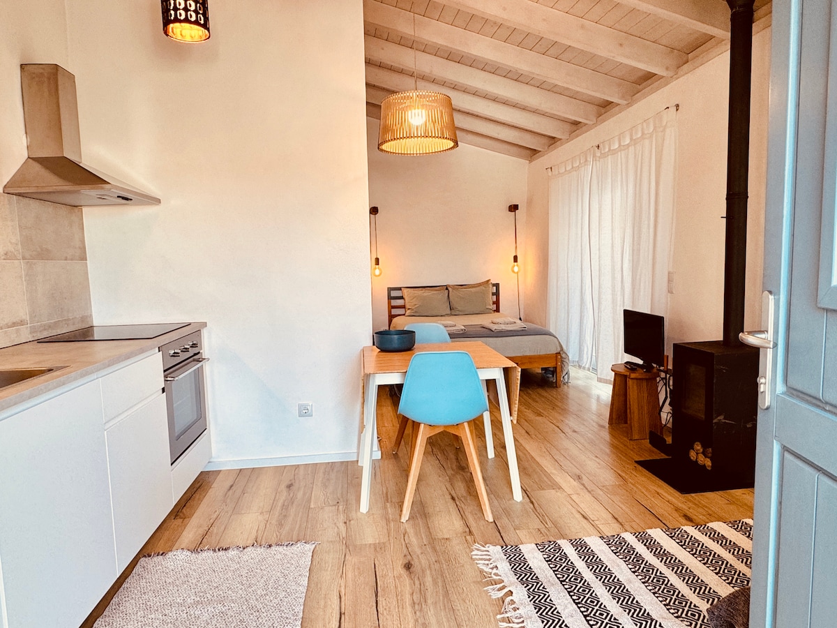 This 2-person stylishly furnished studio is set on the grounds of Monte dos Quarteirões, and is part of 2 residential properties, one of which is private property. It is a fully detached holiday home with privacy surrounded by olive and fruit trees. It has its own terrace, accessible via a private road, and a parking lot. Its quietly located with a magnificent view over the green valley. .