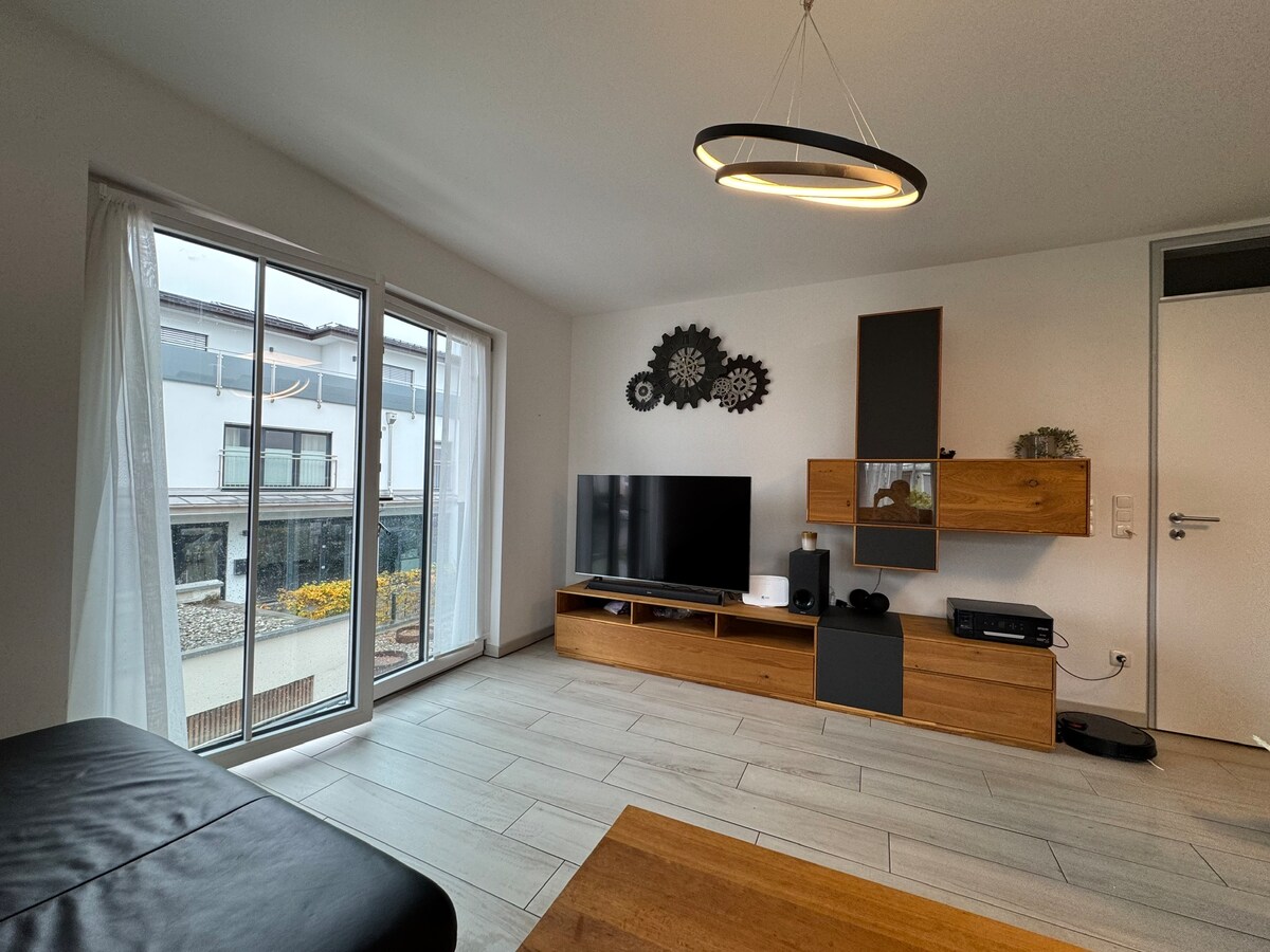 Welcome to GIH Solar and this beautiful 2-room vacation apartment, featuring a large private terrace with seating area. This spacious apartment is perfect for 2 adults or a small family with a child and offers excellent amenities: • Lovely residential area • Walking distance to Kranzberger Badesee lake • Free parking directly on the property • Large Smart TV with Netflix • 1 bedroom with comfortable king-size bed • Fully equipped kitchen