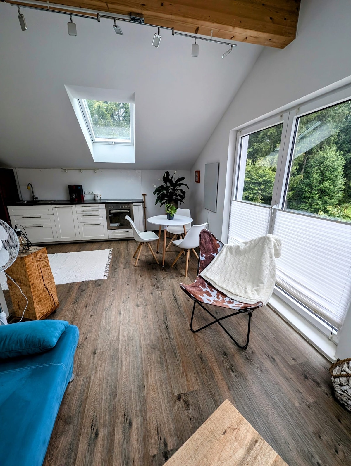 Chúng tôi đã phát triển lại một căn hộ nghỉ dưỡng ở Rettenbach am Auerberg. Một căn hộ có lối vào riêng biệt và giường đôi (giường tầng) trong phòng trưng bày; một "lối đi ẩn nấp" cho hai người cách Munich một giờ lái xe. Ban ngày, khách có tầm nhìn ra bầu trời xanh trắng Bavaria và ban đêm bạn có thể quan sát các ngôi sao từ giường – chúng cũng có vẻ sáng hơn một chút ở Ostallgäu so với Munich do ánh sáng rải rác thấp hơn.