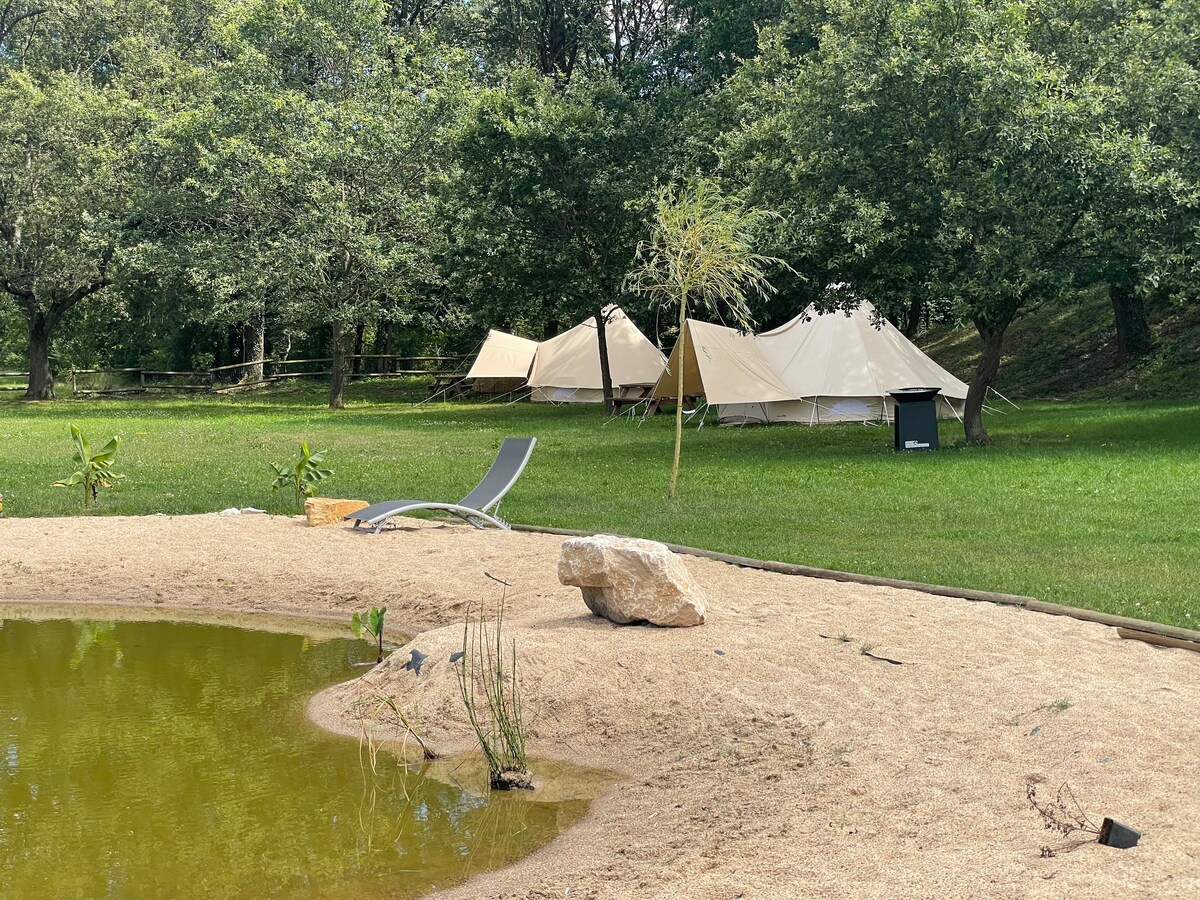 Trên một mảnh đất rộng lớn để có thêm sự riêng tư, một chiếc lều rộng 20 m2 được trang trí theo tinh thần thiền định và lãng mạn. Bồn tắm nước nóng riêng trên sân thượng của bạn. Để có một trải nghiệm khó quên, một hố lửa hướng ra cảnh quan nông thôn để nướng chamallows ( được cung cấp) và sống một khoảnh khắc lãng mạn trước ngọn lửa dưới những vì sao. Nhà vệ sinh khô tại chỗ. Phòng tắm riêng cách lều 40 m. Tủ lạnh với nước ngọt miễn phí. Đã bao gồm bữa sáng, ga trải giường và khăn tắm, dịch vụ vệ sinh