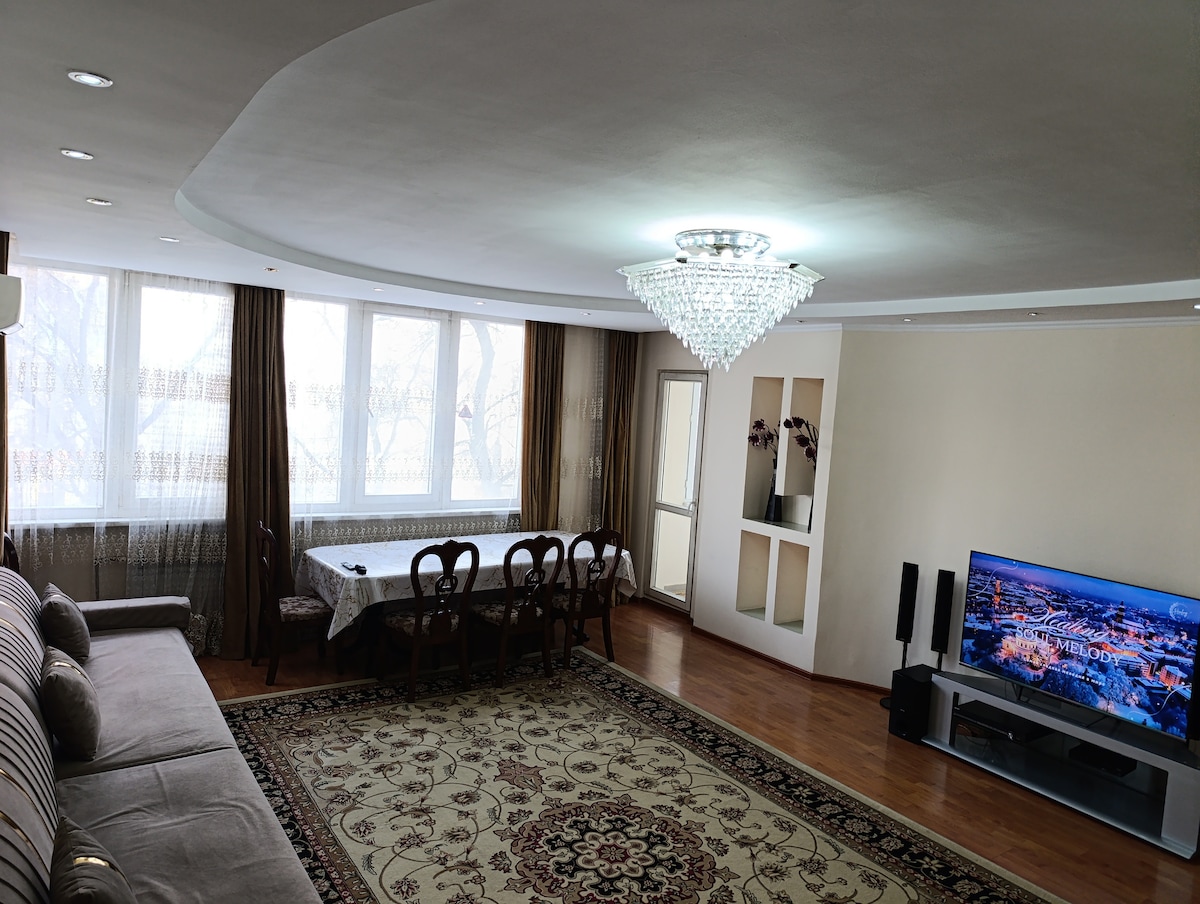 Căn hộ 3 phòng ngủ hiện đại ngay trung tâm Almaty. Rộng rãi và phong cách, với ba phòng ngủ, một phòng khách, một nhà bếp đầy đủ tiện nghi và một nhà vệ sinh và phòng tắm riêng biệt. Đàn piano cho những người chơi và máy chạy bộ cho người chạy trong nhà. Khoảng cách đi bộ đến rạp chiếu phim, công viên, quán cà phê và cửa hàng. Chỉ 20 phút đi ô tô đến Medeo và cáp treo đến khu nghỉ dưỡng trượt tuyết Shymbulak. Một không gian yên tĩnh, gọn gàng và tiện dụng, được thiết kế để mang lại sự thoải mái và một kỳ ở yên bình.