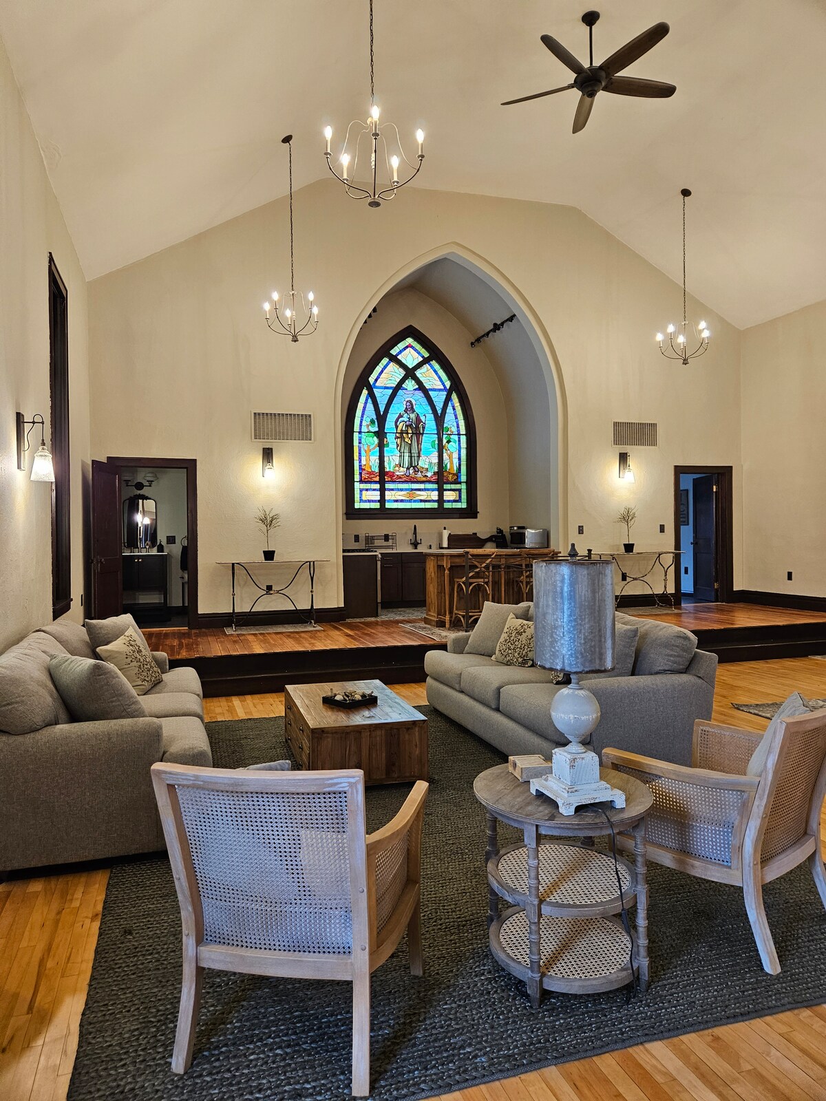 Nhà thờ độc đáo này có một phong cách riêng. Phòng ngủ chính có giường cỡ king và một phòng tắm khép kín với bàn trang điểm đôi. Căn gác với tầm nhìn tuyệt đẹp ra cửa sổ kính màu ngoạn mục bao gồm 2 giường queen. Phòng tắm kích thước đầy đủ thứ 2. Lò sưởi hai mặt trong phòng khách sẽ làm cho bạn ấm cúng khi đốt lửa xem TV 55inch của bạn. Bếp khái niệm khổng lồ và mở được trang bị đầy đủ là một giấc mơ trở thành sự thật. Ghế nhà thờ ban đầu sẽ đặt nhiều chỗ ngồi xung quanh bàn cạnh sống làm bằng tay.