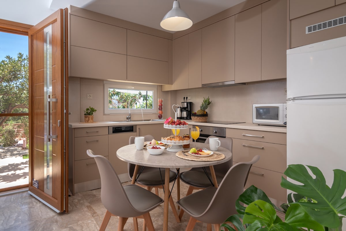 Biệt thự sang trọng gần bãi biển. Ngôi nhà được làm bằng đá truyền thống và có ba phòng ngủ: hai phòng ngủ đôi ở tầng một và một phòng ngủ nữa ở tầng trệt. Nhà bếp và phòng khách là không gian mở và cũng có hai khu vực chỗ ngồi bên ngoài có tiệc nướng. Gần nhà có một bến xe buýt (2 phút đi bộ), siêu thị, tiệm bánh, hiệu thuốc và các loại cửa hàng và nhà hàng khác. Sân bay Heraklion chỉ cách đó 15 phút.