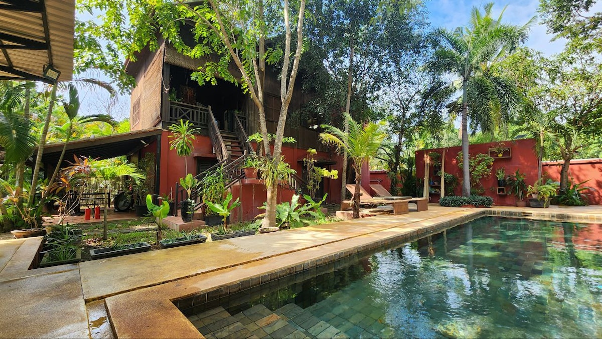 Biệt thự phong cách Khmer tự nhiên với 12 căn hộ bao quanh bởi một khu vườn đẹp. Có hồ bơi, khu vực ăn tối ngoài trời và trong nhà. Nhà bếp của chúng tôi phục vụ bữa sáng, bữa trưa và bữa tối. Chúng tôi cũng có thể sắp xếp lớp học nấu ăn tại nhà cho bạn. Chúng tôi nằm trong khu vực yên tĩnh cách trung tâm thị trấn 2,5 km, phố quán rượu, chợ đêm và ngay sau rạp xiếc, bên cạnh trang trại cưỡi ngựa và xe đạp bốn bánh. Chúng tôi có xe tuk tuk sẵn sàng bất cứ lúc nào.
