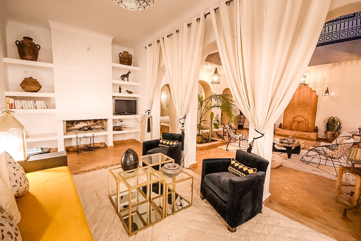 Riad xinh đẹp (Nhà riêng của chủ sở hữu Thụy Sĩ) ở Medina, gần Palais Bahia, chỉ cách Jemaa El Fnaa 10 phút đi bộ. Dịch vụ được cá nhân hóa với đầu bếp toàn thời gian (bao gồm đồ ăn Ma-rốc và châu Âu) và người giúp việc. Thực phẩm với chi phí địa phương. Sự riêng tư hoàn toàn trên 3 tầng với hồ bơi, sân thượng, bồn tắm hơi và boong tắm nắng. Mỗi phòng có một lò sưởi và phòng tắm riêng. Nhân viên đáng tin cậy, với chúng tôi trong 25 năm. Đã bao gồm dịch vụ trông trẻ. Tài xế riêng có sẵn theo yêu cầu đưa đón sân bay (7 khách / 20 €).