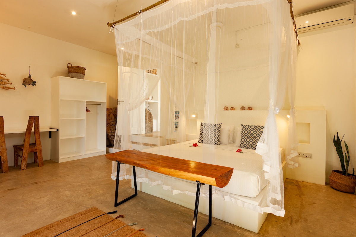 Studio dành cho các cặp đôi hoặc hai người mỗi lần. Nó có tầm nhìn ra biển và thực tế nằm trên bãi biển nhỏ được gọi là Anse D 'amour, có nghĩa là bãi biển tình yêu. Cảng nơi Cat Cocos/Cat Rose berths cách chỗ của chúng tôi 5 phút đi bộ. Trạm xe buýt nằm ngay bên kia đường từ studio và bạn sẽ thấy rất dễ dàng để đi lại bằng xe buýt. Có hai cửa hàng tạp hóa gần đó,một cửa hàng bên kia đường và cửa hàng còn lại, cách 1 phút đi bộ.