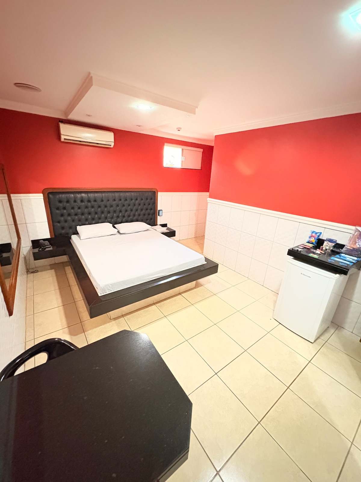 Suíte de MOTEL, com garagem privativa, Dispõe de cozinha com funcionamento 24 horas, com pratos e serviços cobrados separadamente. O espaço foi pensado para proporcionar uma experiência aconchegante, seja para uma noite especial ou uma curta estadia. O quarto conta com cama confortável, ambiente climatizado e decoração moderna, criando um clima agradável e reservado. Tudo é preparado com cuidado para garantir limpeza, conforto e bem-estar