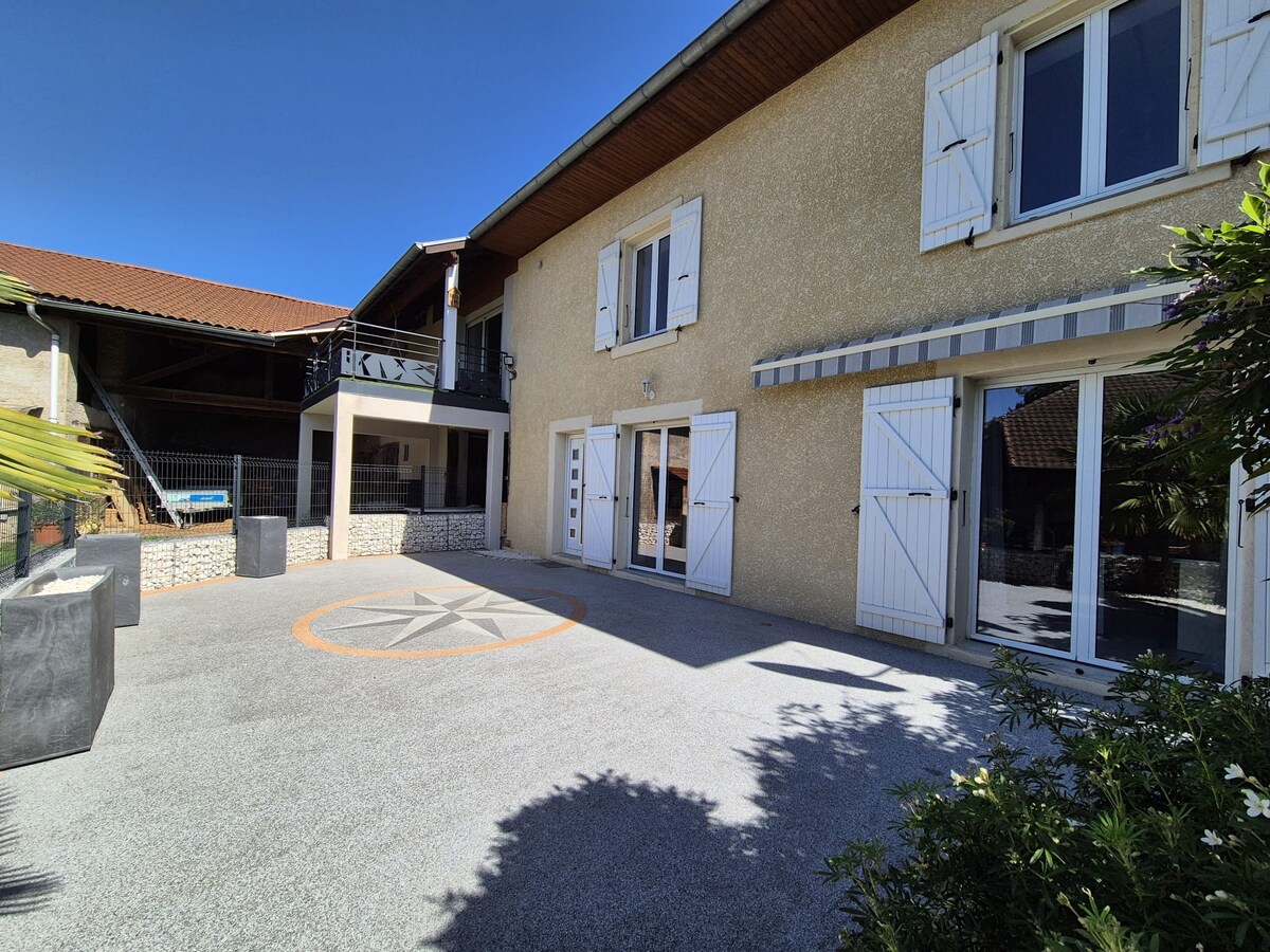 3 grandes chambres appt.indépendant de 80m2 rdc maison de campagne très bien équipé avec 2500 mètres carrés de jardin et splendide vue sur les montagnes. Profitez de ce séjour dans un calme absolu au pied d'une colline verdoyante. Idéalement situé proche du lac de Paladru, des massifs du Vercors et de la Chartreuse. A 15 min de Voiron et 30 min de Grenoble. Parking sécurisé dans notre cour, table et chaises de jardin et petit bbq. Supermarchés à 5 mins en voiture et boulangerie a pied