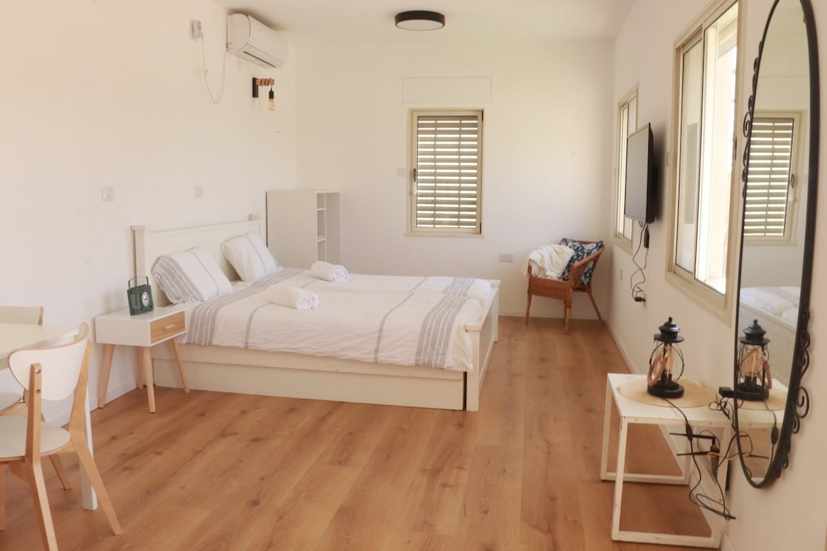 'Trong ngôi nhà của anh ấy trên sa mạc' B&B tuyệt vời, mới và sạch sẽ! Một khu vực tương đối an toàn – rất ít chuông báo động và quan trọng nhất – có một căn phòng an toàn! (Phòng an toàn cho gia đình, của chúng tôi. Hãy xuống cầu thang và vui vẻ tham gia cùng chúng tôi.) Chỗ nghỉ phục vụ bữa sáng này có bếp nhỏ đầy đủ tiện nghi, phòng khách thú vị, phòng ngủ với giường êm ái, mọi thứ đều sáng sủa và có điều hòa không khí. Sân thượng khổng lồ (50 m!!) Nhìn về phía tây, ra những cánh đồng xanh và cảnh hoàng hôn tuyệt đẹp của sa mạc. Zimmer nằm trong khu dân cư Rathamim, Ramat HaNegev, một khu dân cư yên tĩnh và dễ chịu. Nằm ngay trên cảnh quan. Chỉ trong vòng một phút đi bộ, bạn đã là một phần của không gian sa mạc. Hoàn hảo cho những ai đang tìm kiếm sự yên tĩnh và muốn thư giãn khỏi sự náo nhiệt ở trung tâm thành phố.