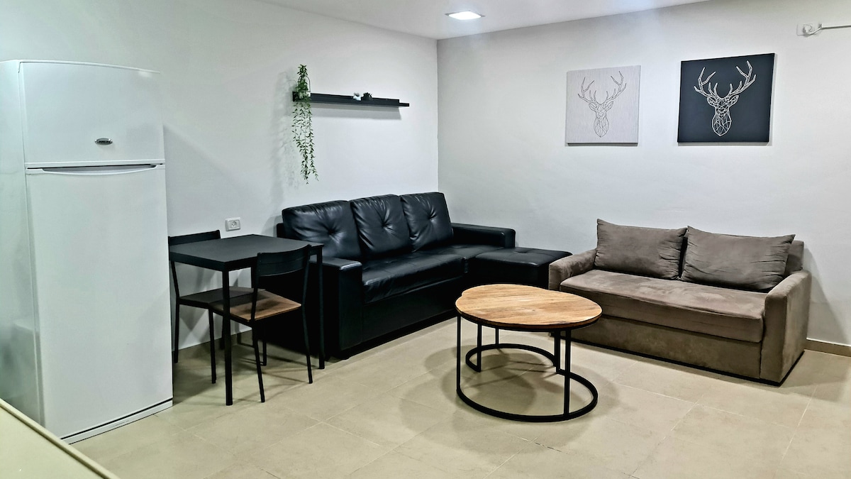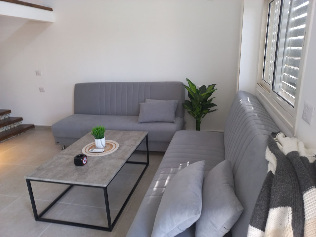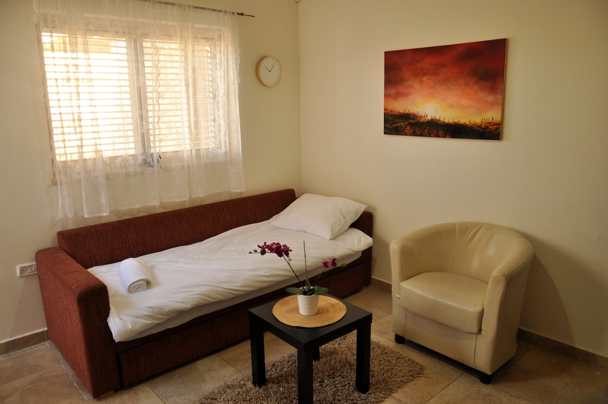 Căn hộ sang trọng riêng biệt trong khu vực xanh, yên tĩnh và mục vụ. Thích hợp cho 4 người lớn hoặc một cặp vợ chồng có hai con. Căn hộ bao gồm một phòng khách với bếp nhỏ, phòng ngủ và vòi sen được trang bị đầy đủ, bãi đỗ xe miễn phí và một khu vườn được cắt tỉa rộng rãi với chỗ ngồi. Nằm trong khoảng cách lái xe đến các trung tâm mua sắm và công viên. Cách "Beer Avraham" trong thành phố cổ và trung tâm giải trí về đêm của Beer Sheva 5 phút đi bộ. Cách Biển Chết chưa đầy một giờ lái xe đến Biển Chết.