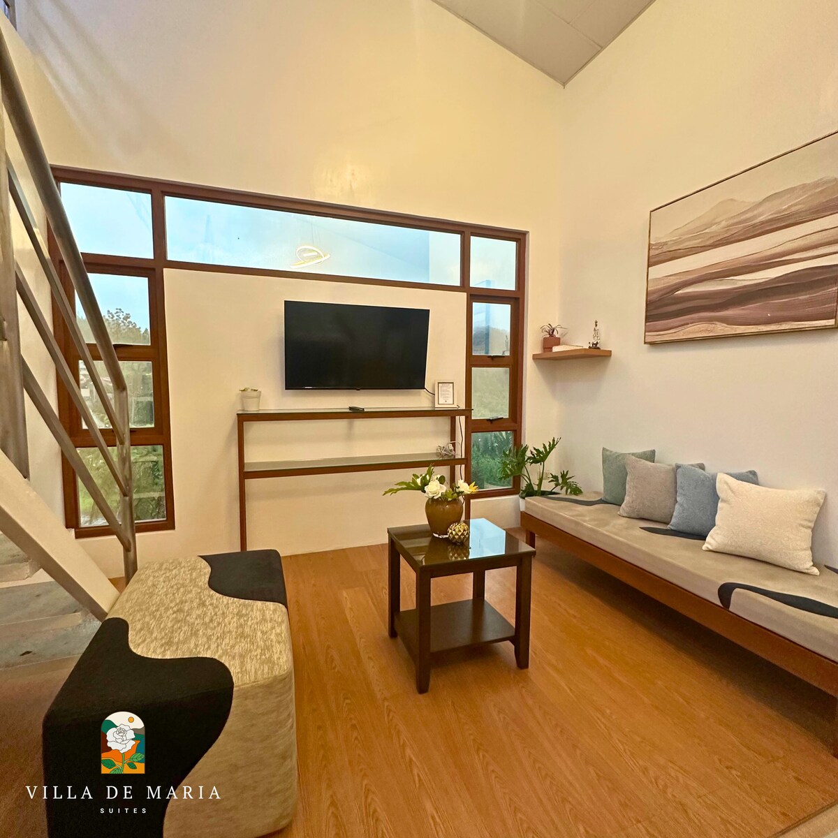 Diamond Suite is a true gem at Villa de Maria Suites — a spacious loft-style retreat perfect for 10–12 guests. It features 5 full-sized beds across 2 bedrooms and a loft, a cozy living area with a 43" Smart TV, a dining space, and a fully equipped kitchen complete with cookware, tableware, and a water dispenser. Enjoy hot & cold showers, hair dryer, fresh towels, and toiletries. Relax at your private corner balcony with a breathtaking 270° view of the sea of clouds, chapel, and Katipunan hills.