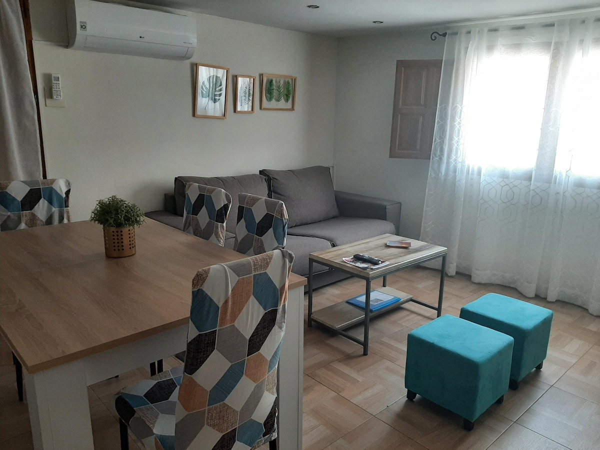 Original apartamento decorado en ambiente rústico, pero con todas las comodidades actuales. Dispone de salón, cocina-comedor, despensa, baño completo y en la parte de arriba dos habitaciones muy originales, separadas por un espacio y cortinas, sin pared Ideal para una familia con niños.