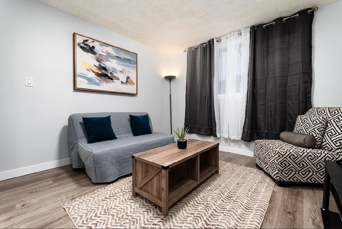 Chào mừng bạn đến với căn hộ ấm cúng và giá cả phải chăng của chúng tôi, hoàn hảo cho những du khách tiết kiệm ngân sách! Nếu bạn đi công tác hoặc tham dự một sự kiện tại Rogers Place, đây là một căn hộ trung tâm tuyệt vời trong vòng vài phút đi bộ từ Rogers Place, Đại học Grant MacEwan và trung tâm mua sắm và nhà hàng Edmonton CityCentre. CHỖ ĐỖ XE MIỄN PHÍ Roger Arena cách đó 3 phút đi bộ Đại học Mac Ewan 4 phút đi bộ Ga tàu 3 phút đi bộ Thông báo: đây là vị trí đắc địa ở trung tâm thành phố, sẽ có một số TIẾNG ỒN và GIAO THÔNG ĐI BỘ.