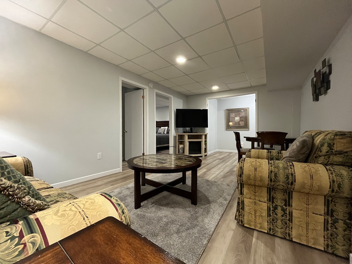 Gần đây chúng tôi đã cải tạo tầng hầm của mình để tạo ra một phòng khách phong cách, hiện đại, ấm cúng và yên tĩnh. Có lối vào bên cạnh mở trực tiếp lên cầu thang đưa bạn xuống căn hộ. Nó có cửa bên ngoài bằng kim loại khóa để cách âm và an ninh. Căn hộ là một căn hộ studio sáng sủa với ba cửa sổ lớn, bếp đầy đủ, khu vực tiếp khách có TV và lò sưởi, bàn ăn, giường cỡ queen, tủ quần áo và phòng tắm riêng của bạn với vòi sen 5 feet. Với cách âm rộng rãi!