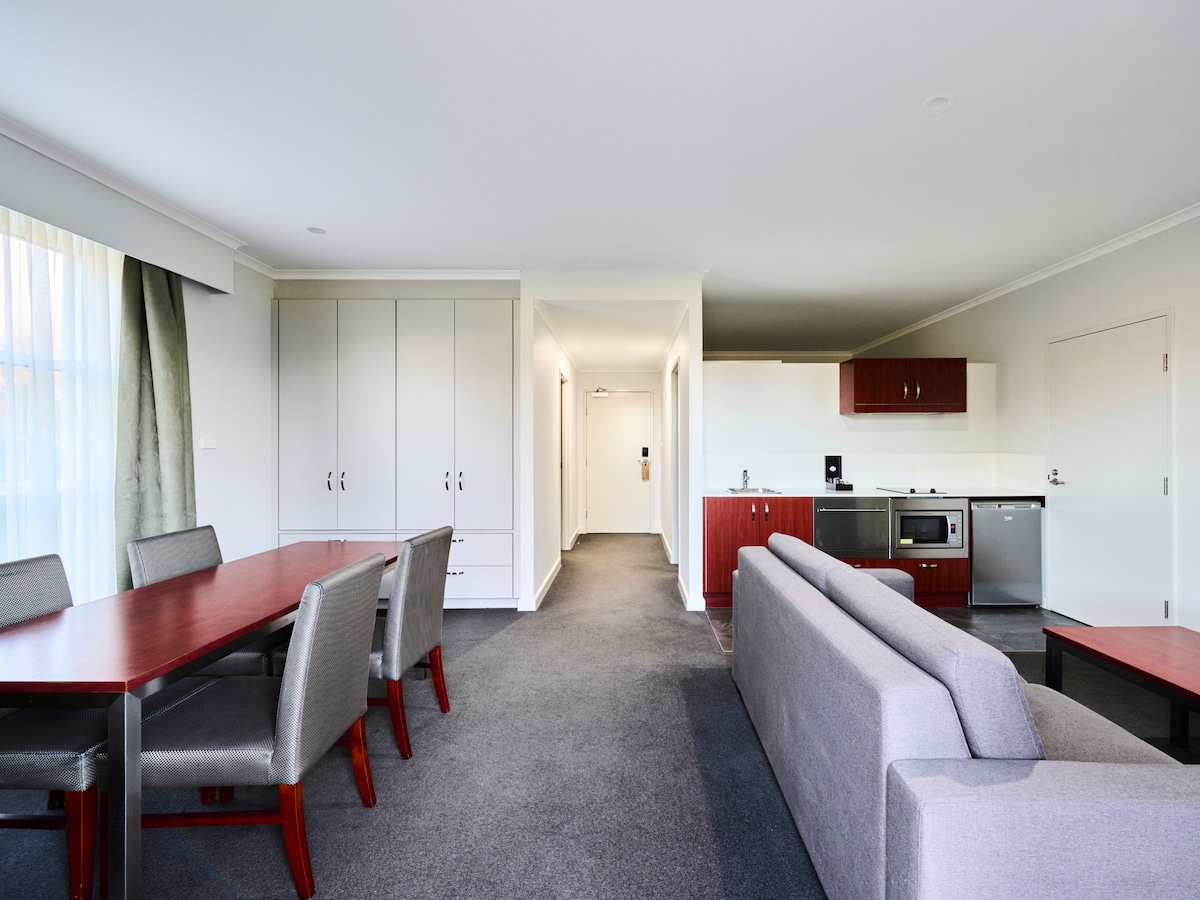 Settle into a stylish Studio Apartment with a queen bed and a fully equipped kitchen with a refrigerator, cooktop, microwave and dishwasher, plus tea and coffee facilities. Enjoy the convenience of an in-room washer and dryer, a television for easy nights in, and your own private balcony overlooking the Capital Public Golf Course.