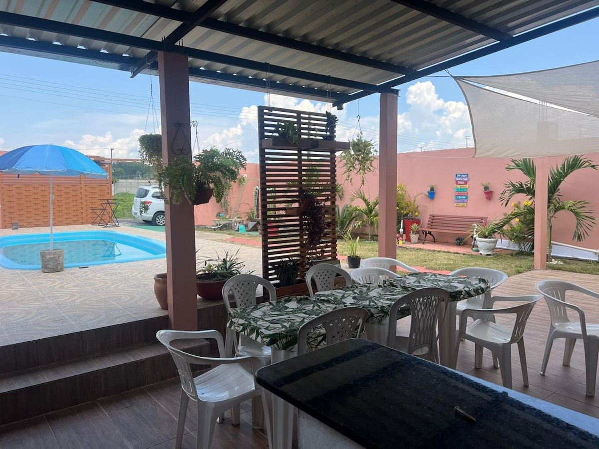 Reconecte-se a quem você mais ama neste lugar ideal para famílias. Uma residência que oferece acomodações confortáveis ( 2 quartos climatizados c camas casal), atadores de redes dentro e fora, 2 ventiladores, banheiro interno/externo, além de uma cozinha equipada, piscina adulto c cascata, edícula com churrasqueira é o cômodo ideal para momentos de lazer e descontração para receber amigos e famliares, garagem p três carros. BE HAPPY OBS.: FEIRA E SUPERMERCADO PRÓXIMO.