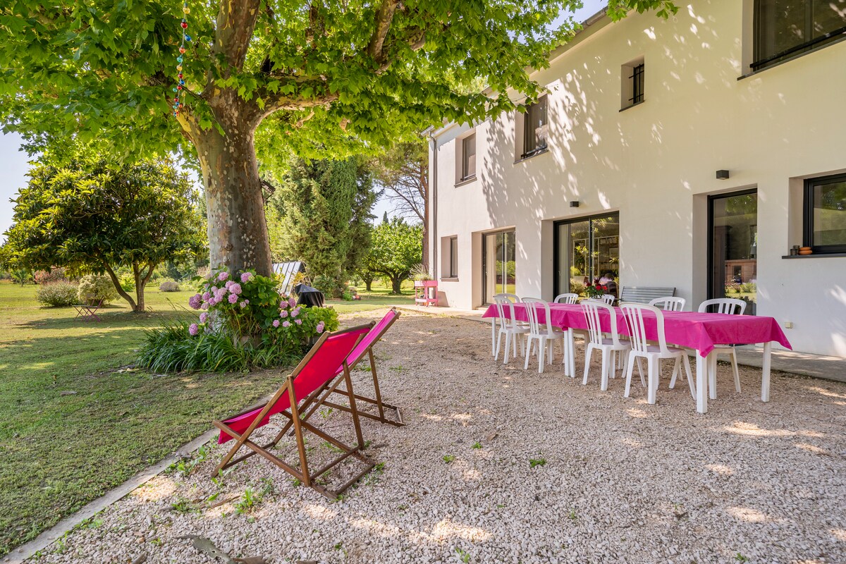 Maison à la campagne au calme à 8 km au sud d'Avignon, dans un beau jardin, climatisation. je serai à votre disposition pour partager quelques conseils botaniques. Vous aurez le choix à de nombreuses pistes cyclables. Vous pourrez aussi prévoir des balades journalières dans les environs, les lavandes, le Colorado Provençal, baignade au pont du Gard et +. Petit déjeuner inclus, Parking privé