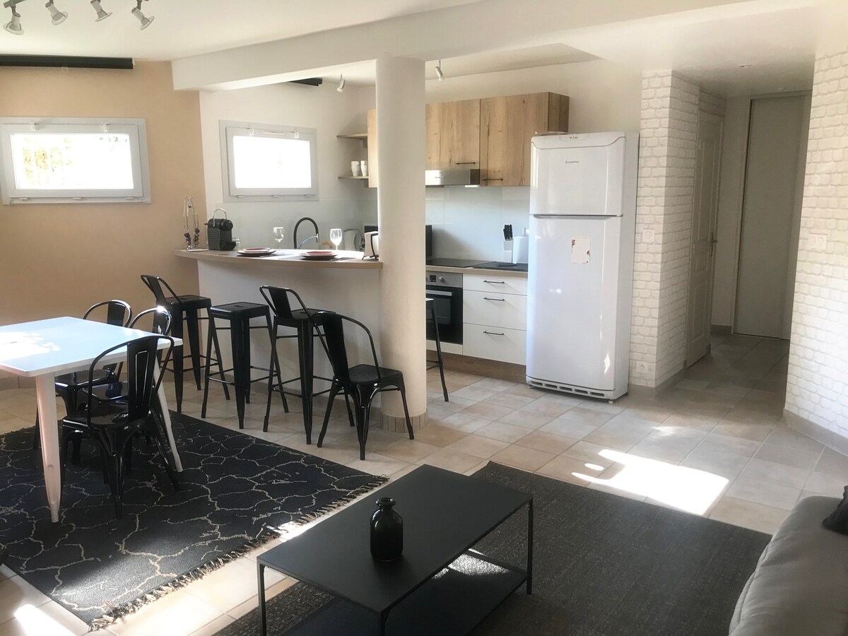 Chỉ cách trung tâm thành phố 10 phút, bạn sẽ cảm thấy như ở vùng nông thôn, trong căn hộ 1 phòng ngủ rộng 70 m² này, trong một khu dân cư yên bình, với quang cảnh tuyệt vời nhìn ra Clermont-Ferrand và khu vực xung quanh. Sân sau có bạt nhún, bếp nướng và hồ bơi ở đây để mang đến cho bạn một kỳ nghỉ hoàn hảo. *** Lưu ý *** Đầu năm 2026: hồ bơi đang được cải tạo và sẽ không thể sử dụng được trước đầu tháng 5. Tôi rất tiếc về điều đó.