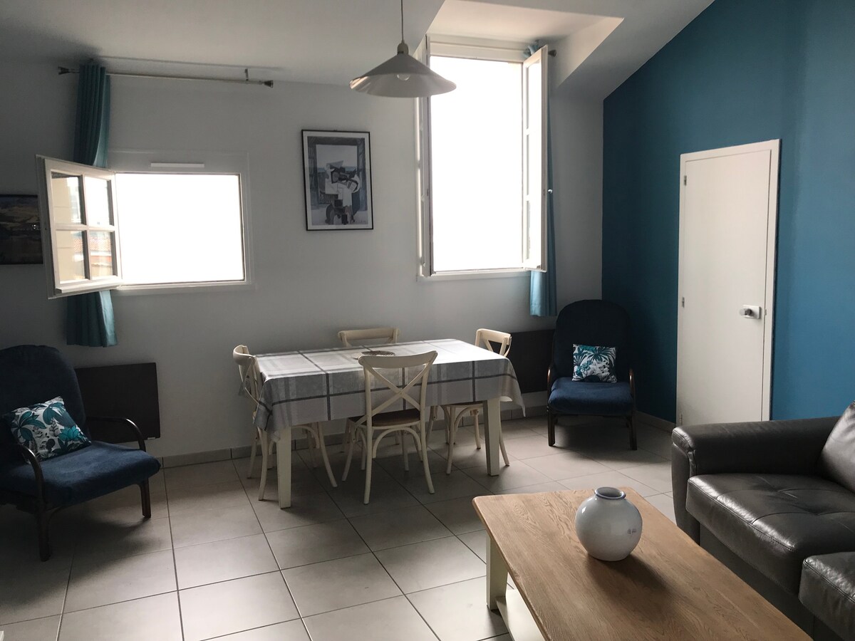 Căn hộ nằm dưới chân bãi biển và tầm nhìn ra biển, bạn sẽ ở trên cát trong vòng chưa đầy 2 phút. Căn hộ nằm trên tầng hai của một nơi cư trú yên tĩnh không có thang máy. Nó bao gồm một phòng khách, một phòng ngủ riêng, một phòng tắm có vòi sen và nhà vệ sinh, diện tích bề mặt là 23,5 m2 (30 m2 không có luật carrez). Quán bar, nhà hàng, tiệm bánh, cửa hàng tạp hóa ngay bên cạnh nơi cư trú. Trạm xe buýt ở dưới đáy nhà. Chú ý không có chỗ đỗ xe, nhưng đỗ xe miễn phí cách đó 200 m.