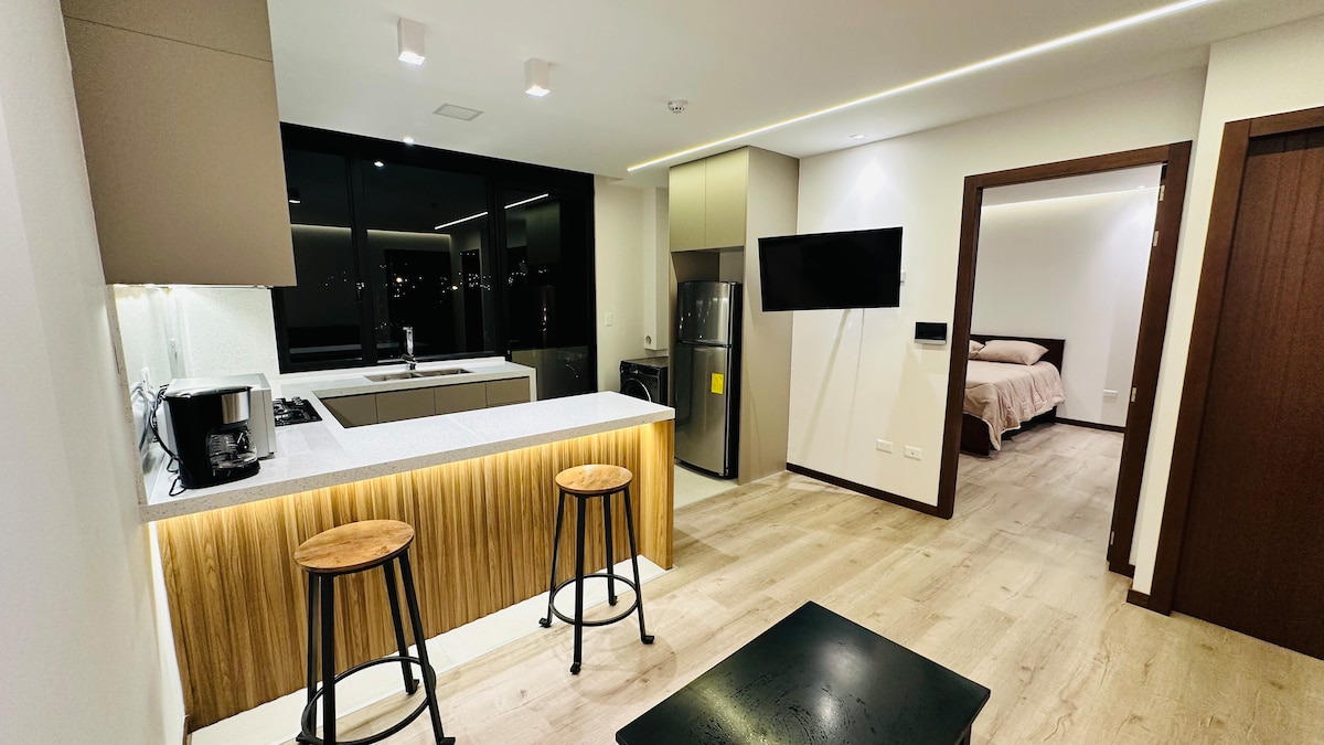 🌿 Ngôi nhà của bạn ở Cuenca Phòng suite 1 phòng ngủ hiện đại với phong cách Địa Trung Hải boho, lý tưởng cho gia đình hoặc cặp đôi. Nó có 2 phòng tắm, bếp đầy đủ tiện nghi, WiFi, TV, máy giặt và máy sấy, cùng với quyền sử dụng hồ bơi, phòng tập thể dục và bãi đỗ xe miễn phí, tất cả trong một tòa nhà riêng. Nằm trong khu vực yên tĩnh và chiến lược của Cuenca, gần các nhà hàng, trung tâm mua sắm và xe điện, và chỉ cách Trung tâm lịch sử 10 phút. Thoải mái, thanh lịch và hoàn hảo cho thời gian bạn ở.