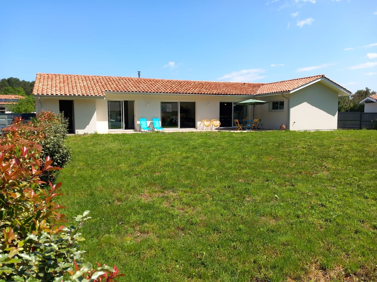 Ngôi nhà mới được bao quanh bởi rừng bên cạnh lối đi xe đạp và bãi biển của bờ biển Landes Nó bao gồm một phòng khách với bếp kiểu Mỹ, 3 phòng ngủ bao gồm 1 phòng chính với phòng tắm và nhà vệ sinh , để hoàn thành một phòng tắm khác và nhà vệ sinh độc lập. Cáp kết nối Internet 🛜 Đối với bên ngoài, một hồ bơi phía nam đầy đủ 4 x 8,5 m được sưởi ấm từ tháng 4 đến ngày 11 tháng 11 với khu vườn cảnh quan và 110 m2 sân thượng bằng gỗ. Bãi biển và sân golf Moliets và maa cách đó 10 phút Vieux Boucau 15 phút Hossegor 28mn . Biarritz 50mn