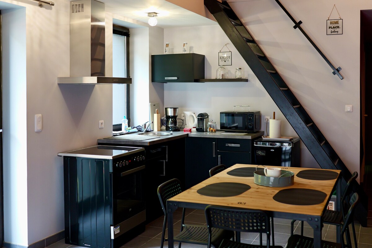 Căn hộ 60 m2 có lối đi thẳng ra ngoài Dành cho 1 hoặc 2 người và em bé Phòng ngủ đôi có TV Phòng khách có TV Bếp nhỏ và khu vực ăn uống (tủ lạnh, lò nướng, lò vi sóng, bếp từ, bát đĩa, v.v.) Phòng tắm (vòi sen và bồn tắm) Phòng vệ sinh tách biệt Khu vực thư giãn (tài liệu, trò chơi trên bàn, v.v.) Sân hiên riêng Gần Euro Vélo 3, chỗ ở được dán nhãn "Accueil Vélo" từ năm 2024 Điểm khởi hành của các tuyến đường đi bộ đường dài và đạp xe leo núi ngay dưới chân ngôi nhà.