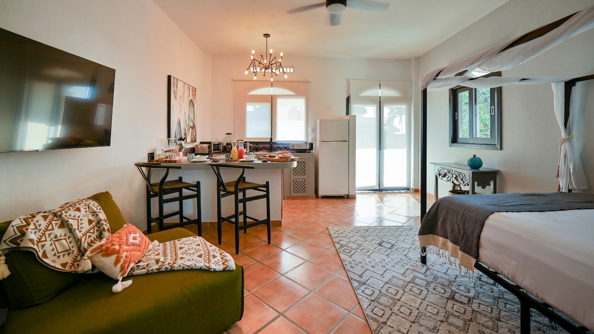 Khám phá sự hài hòa hoàn hảo giữa truyền thống và hiện đại trong studio theo phong cách Mexico của chúng tôi. Với khu vực cây xanh rộng rãi, internet, tivi, bếp từ, điều hòa không khí và khu vực giải trí có bàn bi-a. Chúng tôi cũng cho phép một con chó cỡ nhỏ hoặc trung bình! Chúng tôi không chỉ cung cấp một ngôi nhà ấm cúng mà còn là lựa chọn để tổ chức các lễ kỷ niệm đặc biệt của bạn. Chúng tôi cung cấp dịch vụ sự kiện cho đám cưới hoặc các dịp khác trong không gian xanh tuyệt đẹp của chúng tôi.