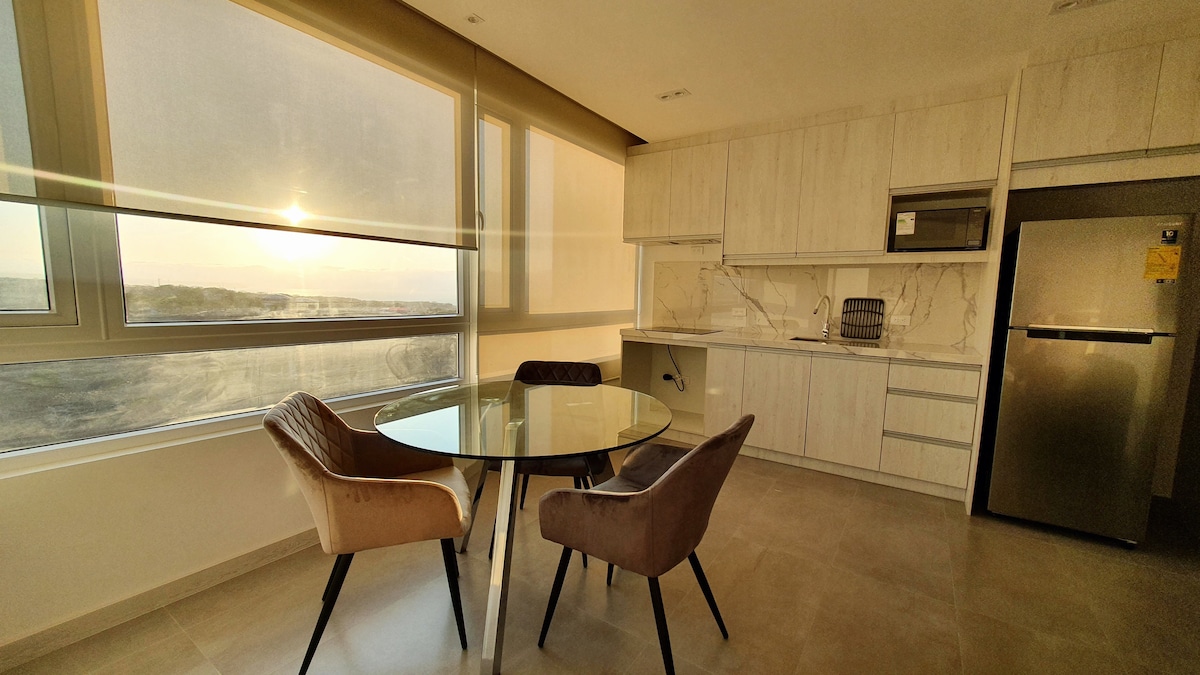 Căn hộ hiện đại với tầm nhìn ra đại dương, cách Bãi biển El Murciélago (địa điểm tổ chức Ironman 70.3), Mall del Pacífico và các nhà hàng địa phương hàng đầu vài bước chân. Hoàn hảo cho kỳ nghỉ/làm việc từ xa với màn hình được cung cấp. Yên tĩnh, tránh xa tiếng ồn từ đường phố. An ninh 24/7 và internet cáp quang tốc độ cao. Tiện nghi bao gồm hồ bơi, phòng xông hơi khô và bể sục (mở cửa từ thứ Ba đến Chủ nhật, có thể thay đổi mà không cần thông báo trước). Tòa nhà có máy phát điện cho các khu vực chung và UPS giữ cho WiFi hoạt động. Thang máy, nước và internet hoạt động trong thời gian mất điện.