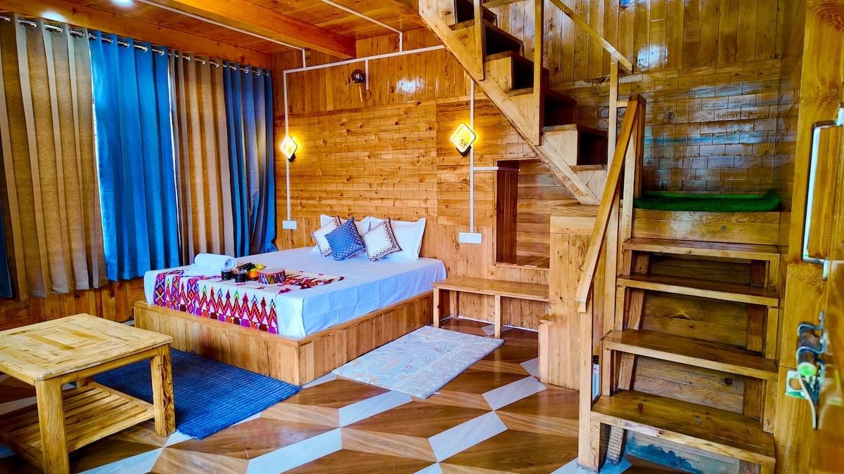 "Chào mừng bạn đến với cabin gỗ ấm cúng của chúng tôi nằm ngay trung tâm Jibhi, Himachal Pradesh đầy mê hoặc, nơi mỗi buổi sáng, bạn sẽ thức dậy với khung cảnh ngoạn mục của đèo Jalori hùng vĩ. Chỗ ở theo phong cách cabin gỗ tròn của chúng tôi mang đến bầu không khí ấm áp và mộc mạc, được bổ sung hoàn hảo bởi các tiện nghi hiện đại cho sự thoải mái của bạn. Phòng ngủ có tầm nhìn tuyệt vời ra đèo Jalori, làm cho mỗi buổi sáng trở thành một khoảnh khắc kỳ diệu khi bạn mở mắt ra sự hùng vĩ của thiên nhiên,