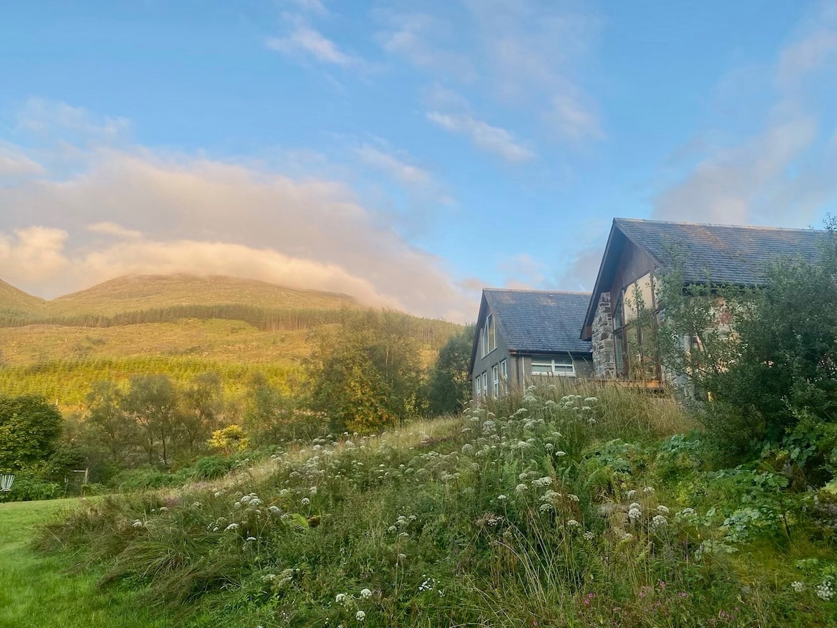 Chỗ ở tuyệt đẹp này nằm giữa những khu rừng trên sườn đồi phía trên hồ Loch Etive, với tầm nhìn tuyệt đẹp ra Ben Cruachan. Nhà nghỉ sang trọng này cung cấp nhiều không gian với tầm nhìn ra rừng và núi từ mọi cửa sổ. Nhà nghỉ được bao quanh bởi sàn riêng với bồn tắm nước nóng riêng, nơi hoàn hảo để thư giãn trong không khí núi non sắc nét và tận hưởng khung cảnh tuyệt đẹp. Nó có thể chứa một nhóm lớn trên bốn phòng ngủ, tất cả đều có tầm nhìn đẹp và được phục vụ bởi ba phòng tắm cao cấp.