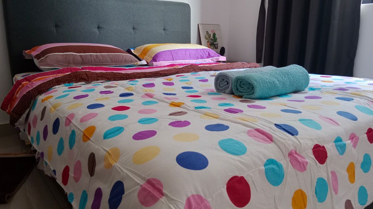 Căn hộ nằm tại Desaru Utama Residence với tầm nhìn ra hồ bơi, bên trong trung tâm thành phố. Một nơi thuận tiện và hoàn hảo cho gia đình, nhóm bạn bè, cặp đôi, khách đi công tác và những người khác ! Căn hộ này có thể chứa tối đa 6 khách ! 2 chỗ đỗ xe MIỄN PHÍ Phòng ngủ chính: 1 giường cỡ king Phòng ngủ giữa: 1 giường queen Phòng ngủ giữa: 1 giường đơn - SKS Mall Desaru (5 phút đi bộ) - Trang trại trái cây Desaru (10 phút lái xe) - Muzium Nelayan (10 phút lái xe) - Bãi biển Desaru (15 phút lái xe) - Công viên nước Desaru Coast (20 phút lái xe)